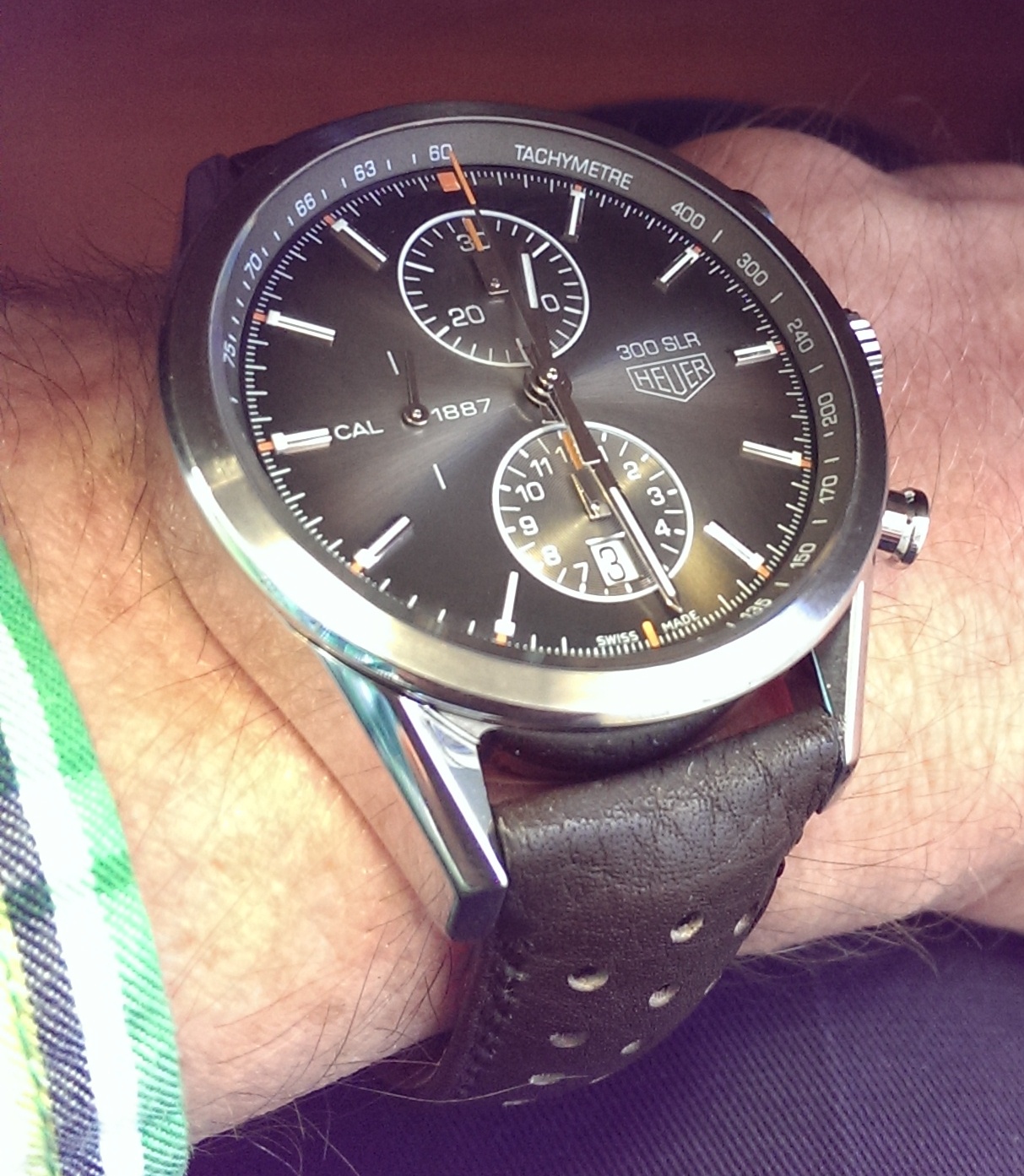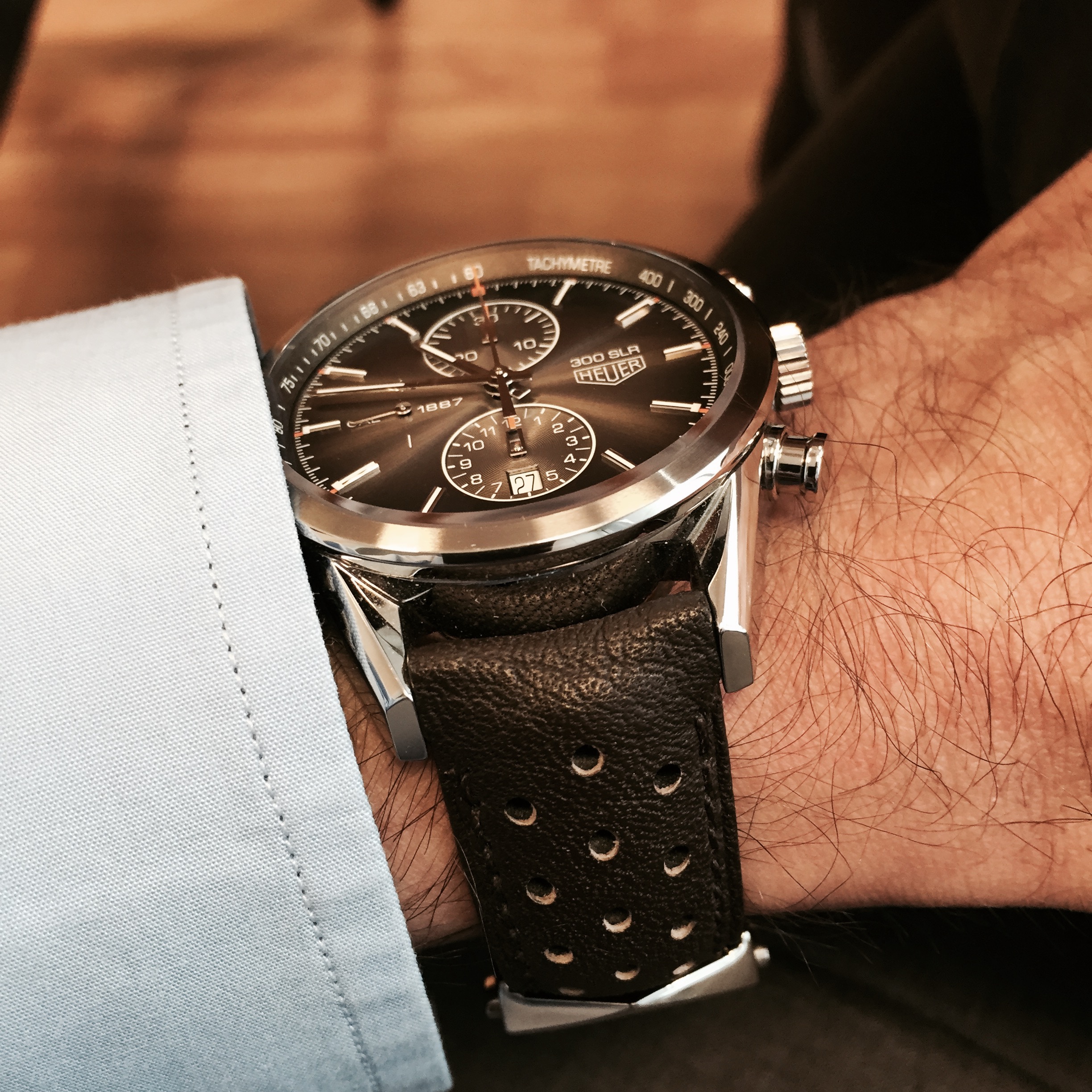Not the best shot on my part. I was so eager to post before I went out. The watch feels so light courtesy of the leather strap and titanium case, but isn't cheapened in any way by that lightness. The pushers have a crisp effortless feel to them. The back is smoky black, the internal parts are black and the Tag logo is also black but just seems to shine silver in the right light with a slight wrist adjustment. Just realised this turned into a mini review but can't believe I was just browsing in Sydney today and the wife said, "Geez that's a great discount, I'd get it if I was you". I couldn't believe my ears and thought I'd better go back in whilst the going was good!!