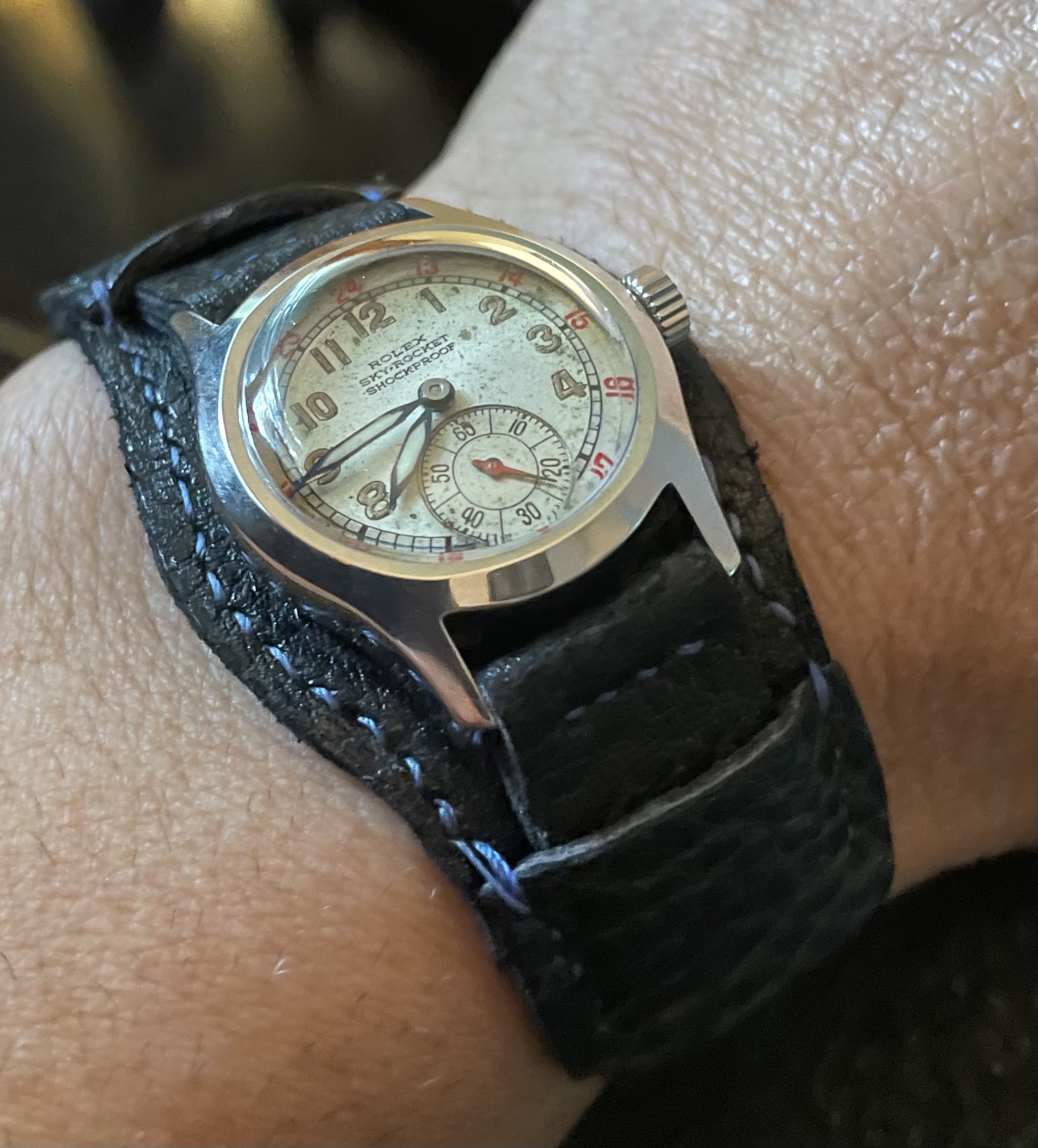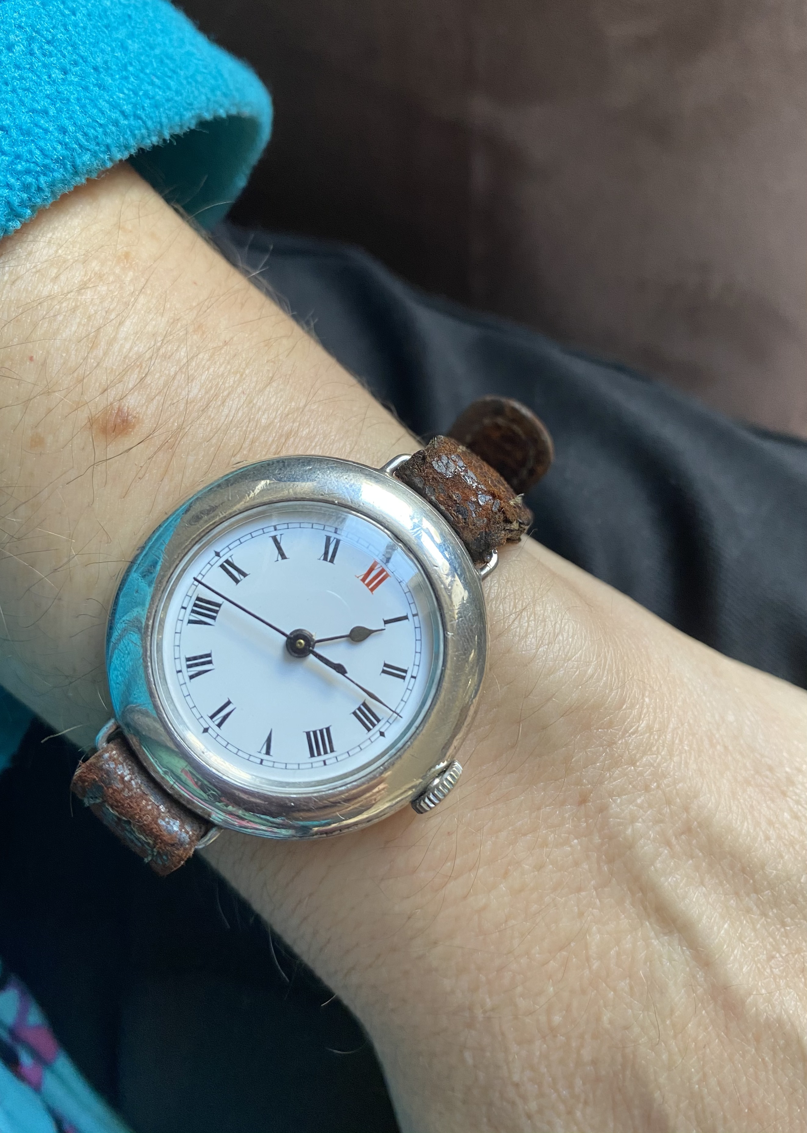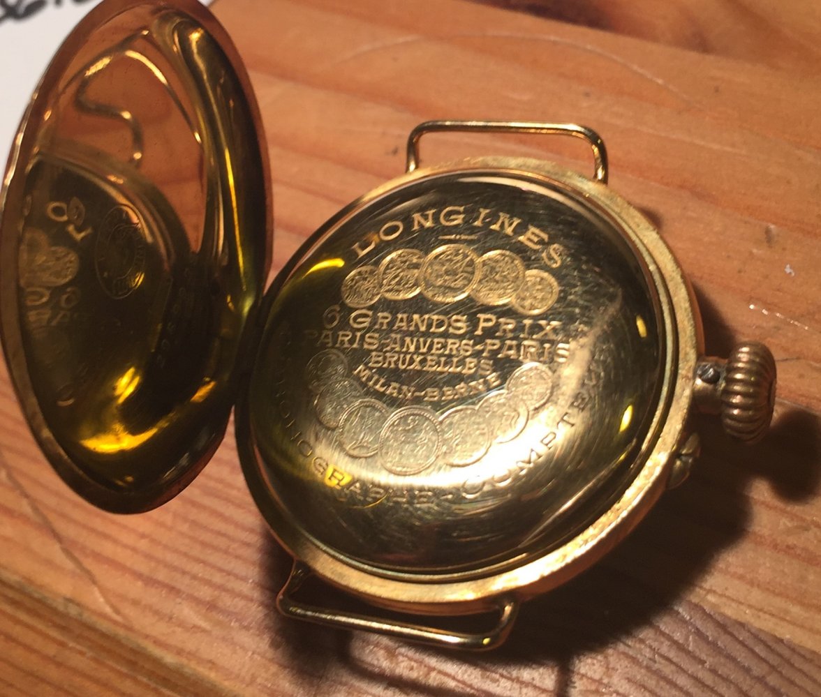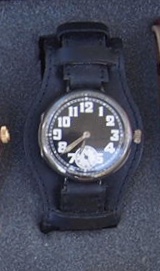 This 1906 Dueber Hampden, which started out its life as a pocket watch but was re-cased as a wristwatch probably in the early 1920s. Mail-order conversion kits for transforming pocket watches to wristwatches, such as the kit used to transform this piece, were popular in the 1920s. The movement is "The Four Hundred", which is a "lever-set" movement -- i.e., the time is set by first pulling out a small lever then rotating the crown, rather than pulling out the crown and rotating it as with modern movements. The lever can be seen at the 5:00 position.