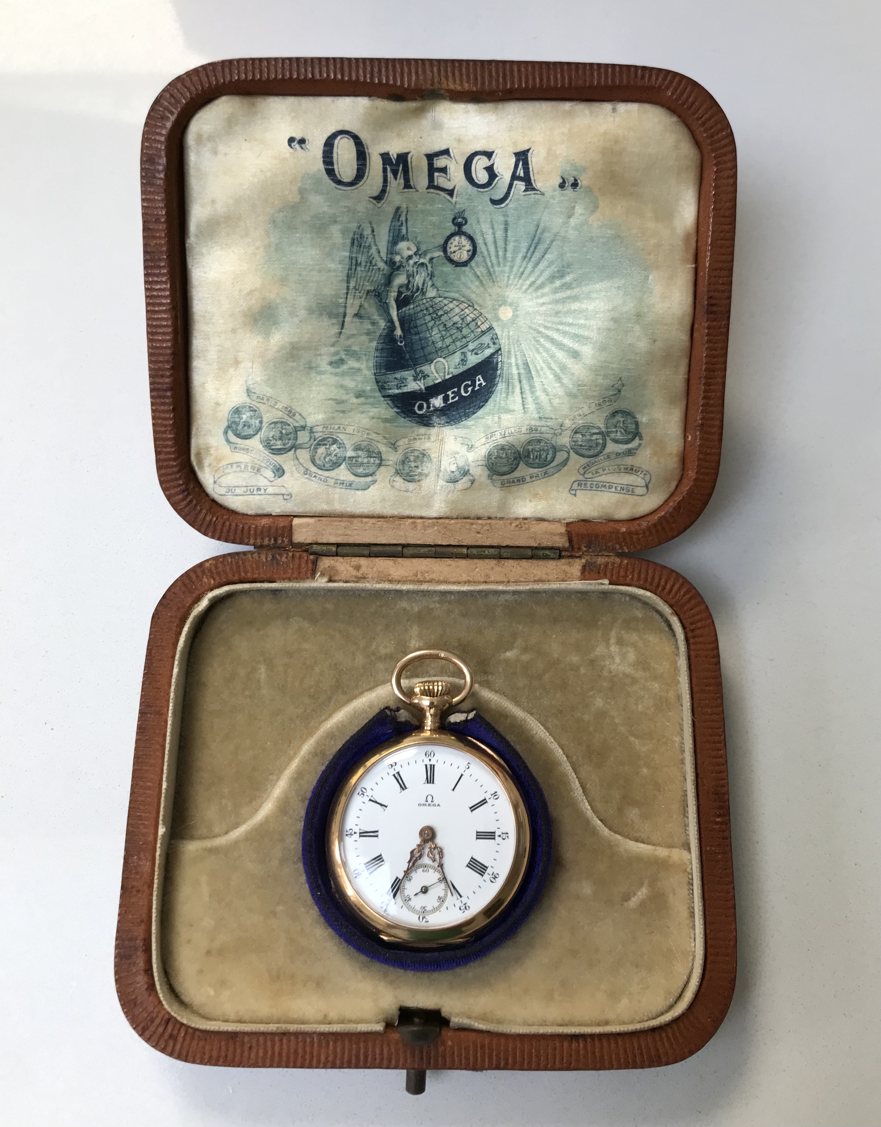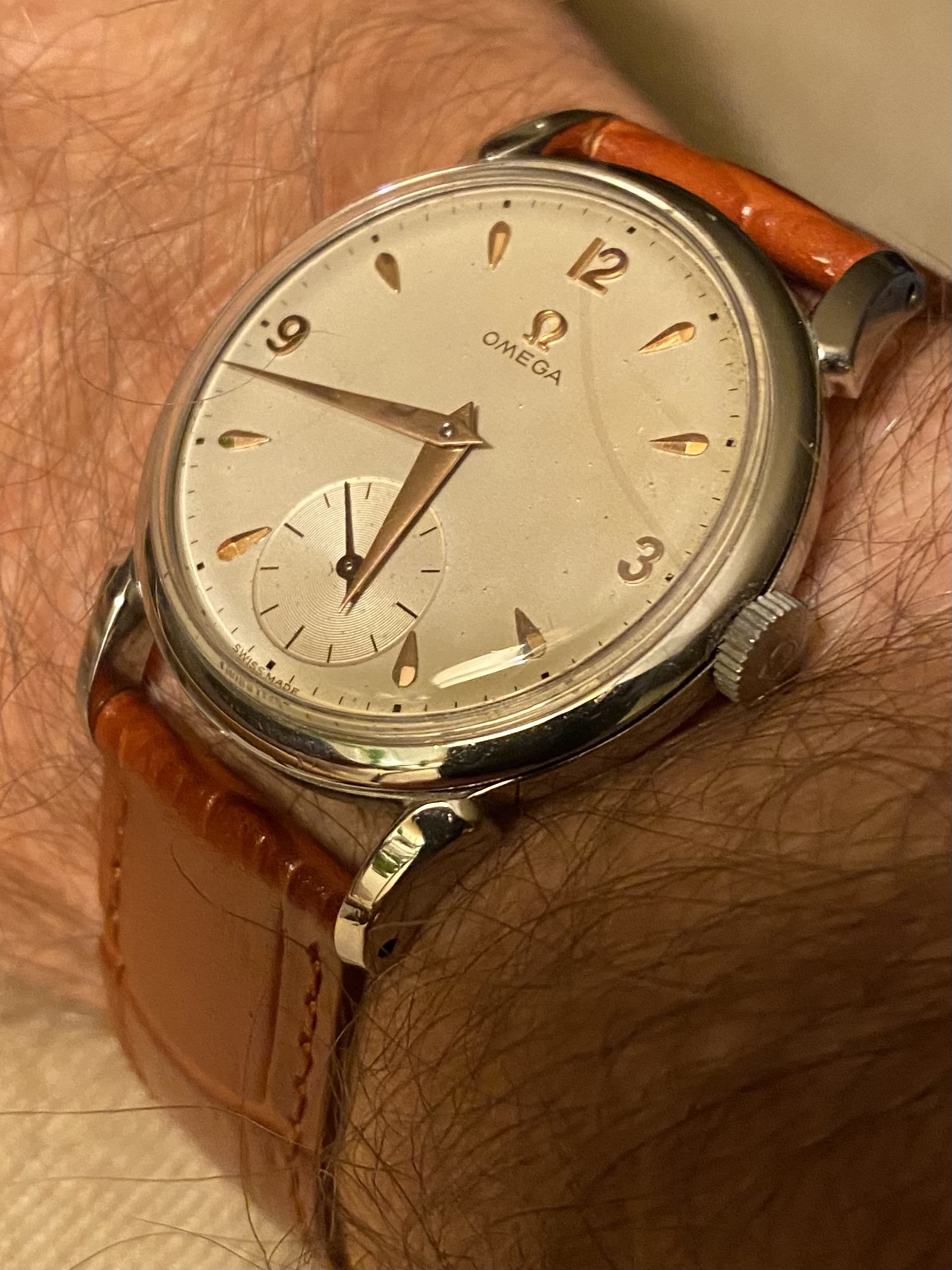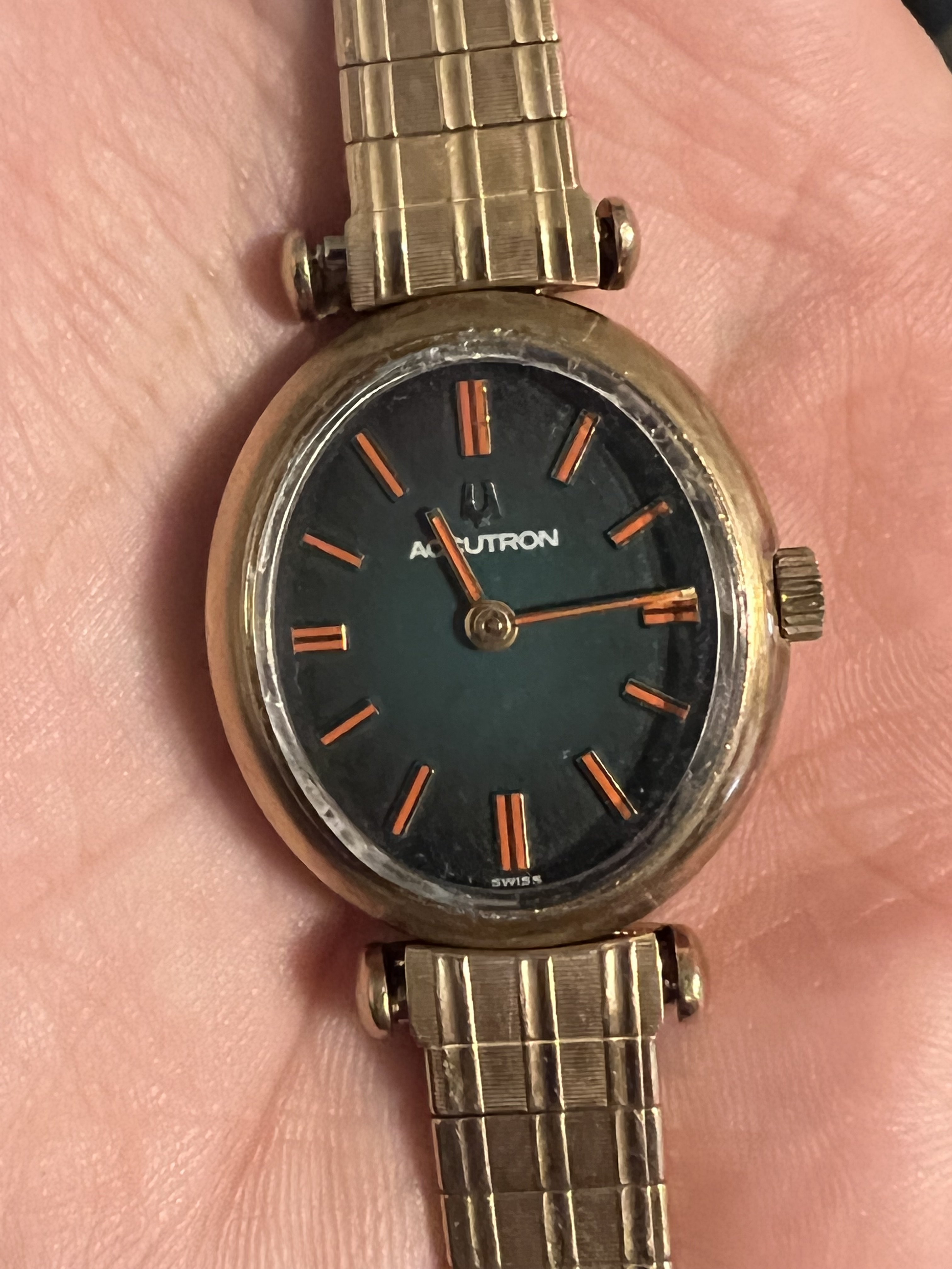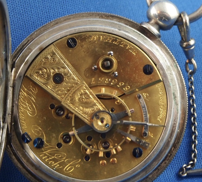 This 1906 Dueber Hampden, which started out its life as a pocket watch but was re-cased as a wristwatch probably in the early 1920s. Mail-order conversion kits for transforming pocket watches to wristwatches, such as the kit used to transform this piece, were popular in the 1920s. The movement is "The Four Hundred", which is a "lever-set" movement -- i.e., the time is set by first pulling out a small lever then rotating the crown, rather than pulling out the crown and rotating it as with modern movements. The lever can be seen at the 5:00 position.