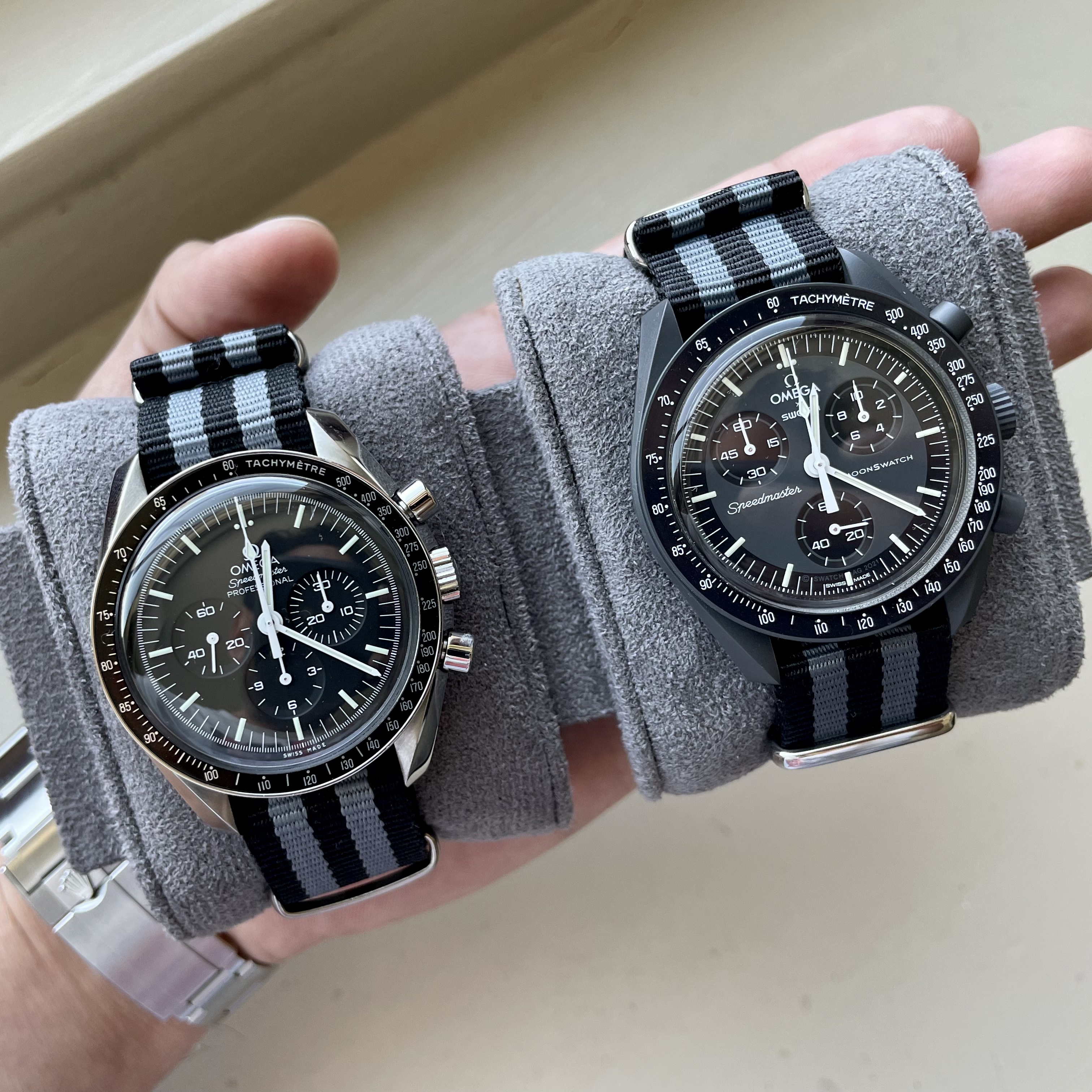 ·well, in this YouTube review only positive vibes without even mentioning " Quality Control " but great to show both the manual winding Omega Speedmaster next to a quartz moonSwatch as the latter just has to look the part ...