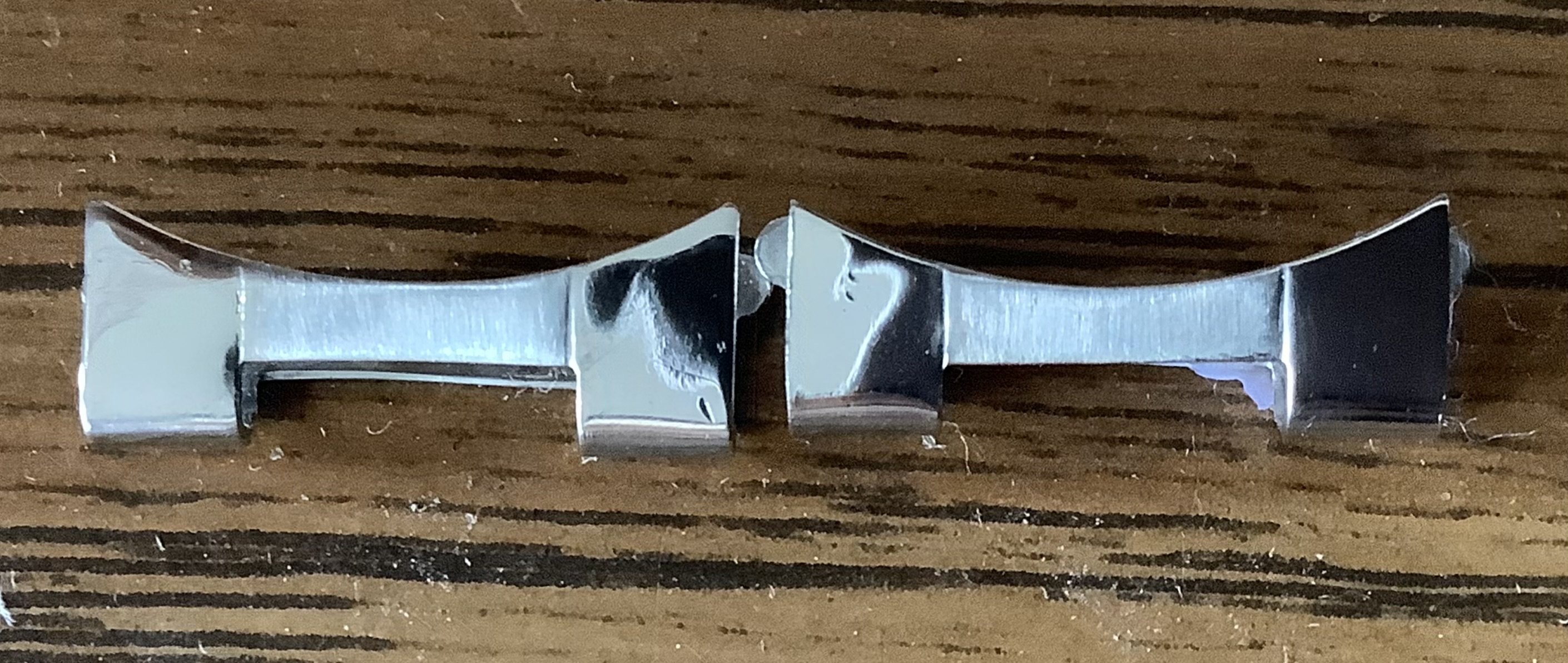 So I figured: distress the existing one to match, or spiff the new link to match its neighbor, and the bracelet. So I chose the latter, and got out the sandpaper for the satin finish, the polisher for the ends, and some tools to remove the dent. After shot: