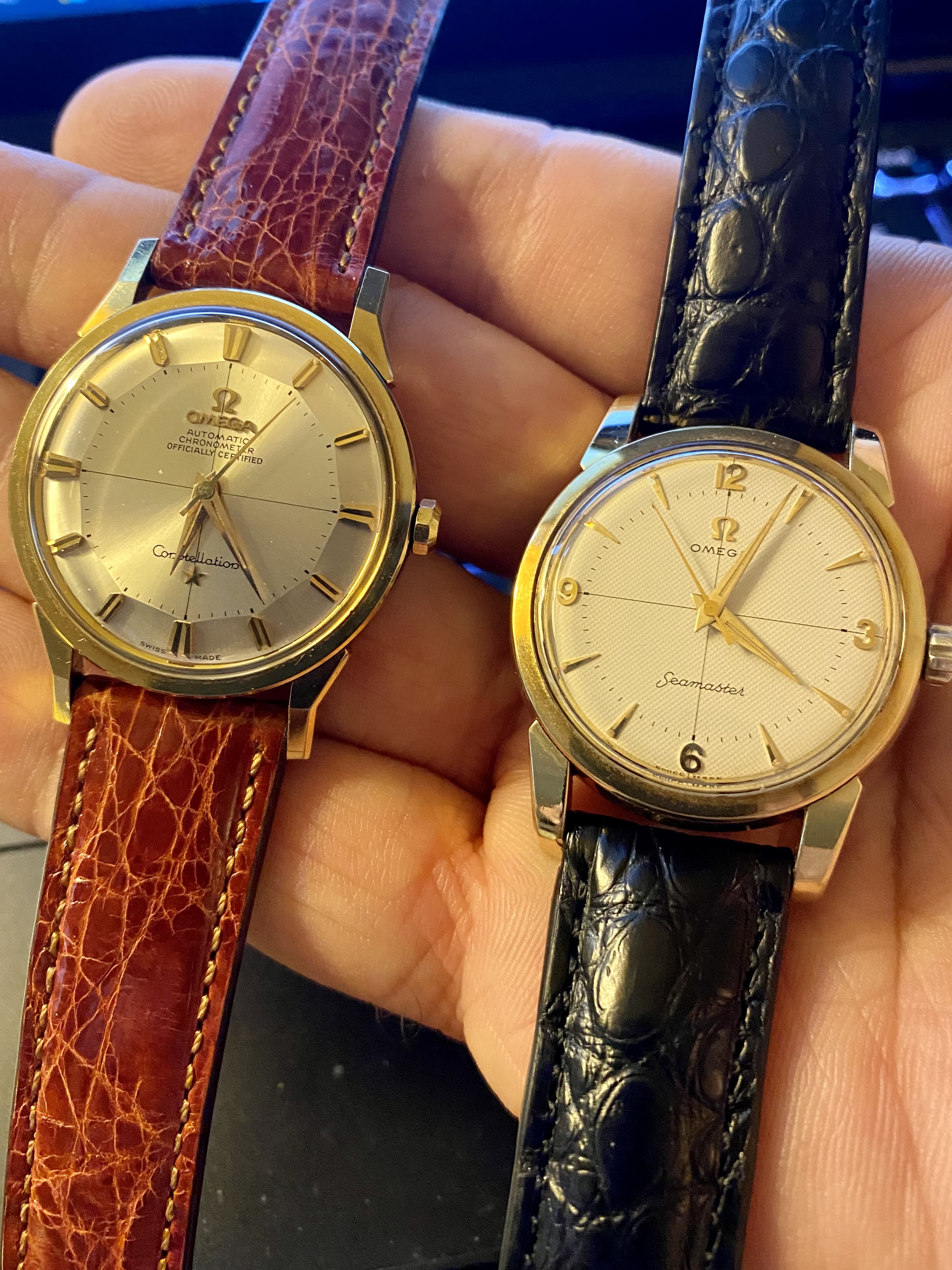 A great pair. What I love about Omega is that they've always had a very distinctive style of case and movement...nothing else like them. Plus they are both elegant, as well as rugged. My only complaint with my Constellation is trying to get a grip on the winding crown...the style of the crown just doesn't give hand any traction. On the positive side, I've never had to wind it since I got it...it just keeps running. And these classic sizes are from a golden age in mechanical watches. Curious...which one do you find yourself wearing the most?