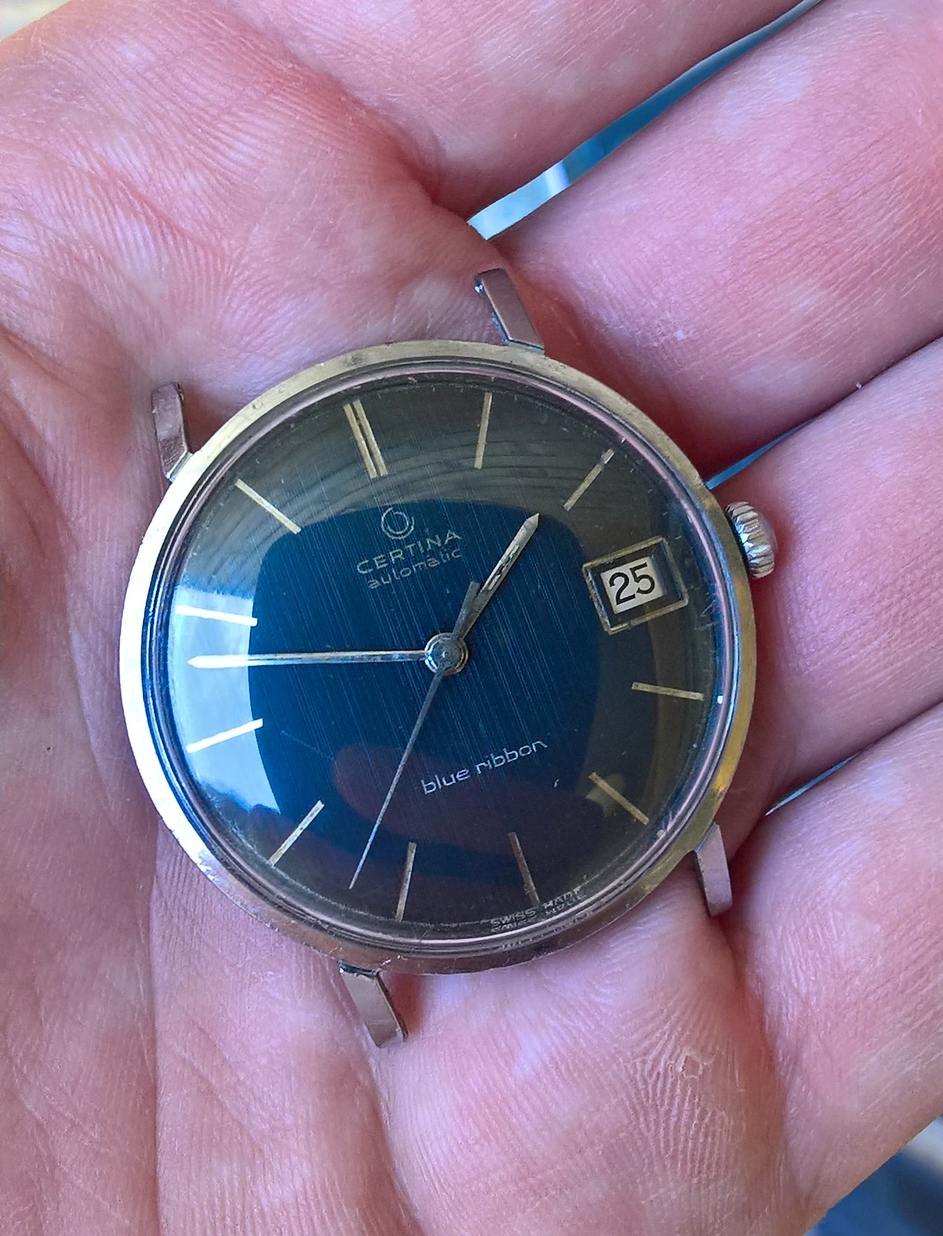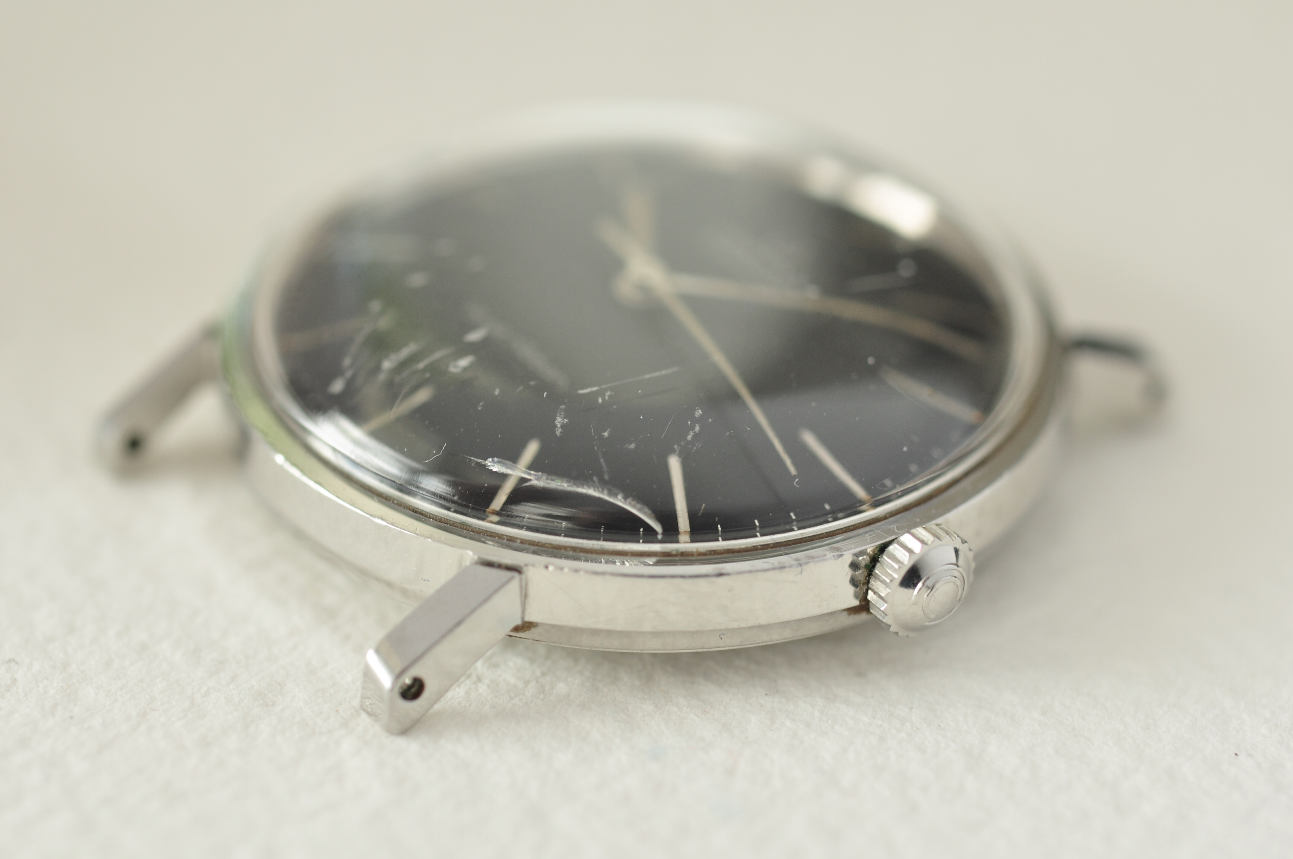 To bring the thread back down to earth my Blue Ribbon arrived his morning. The crystal has a crack in it so it’ll need replacing, but still I had a good 20 minutes with the polywatch to try and get it as good as I can. Also there was enough wrist cheese on this to make a pizza. I thought I’d got it all but can see some still lurking under the crown in the pictures.