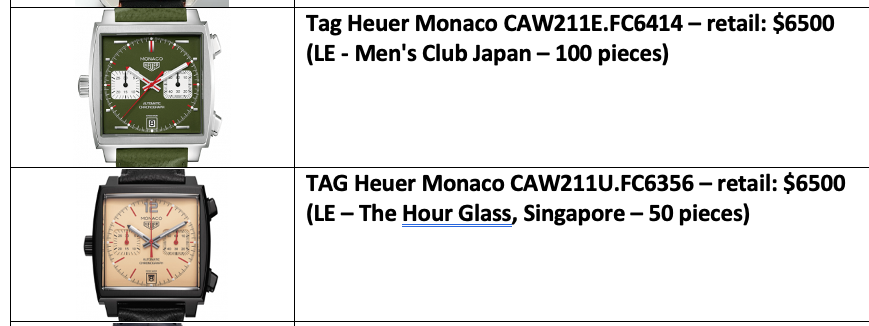 Posts 314 Likes 1,050 matthew_VA ยทJul 28, 2022 Trying to track down either of these CAW211* Monaco LE's - Men's Club Japan and/or The Hour Glass. If you happen to know of one available, please let me know! happy to provide finder's fee...