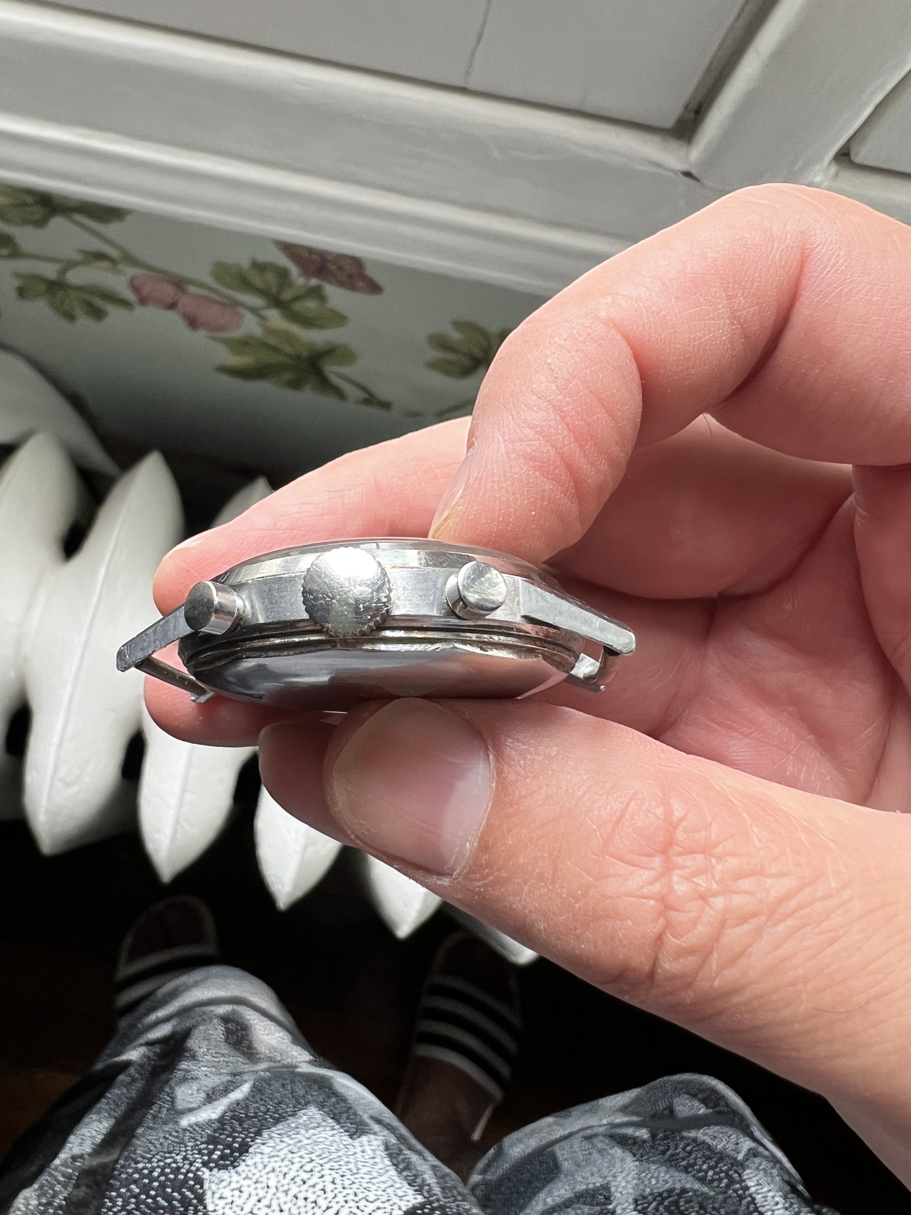 I received this watch in a trade with a well known Heuer collector a few years back. This is a three register, black-dial pre-Carrera chronograph with painted Radium numeral and gilt accents. It is in the original ‘waterproof’ screw back case from the 1940s / 50s. The serial number between the lugs is 67190.