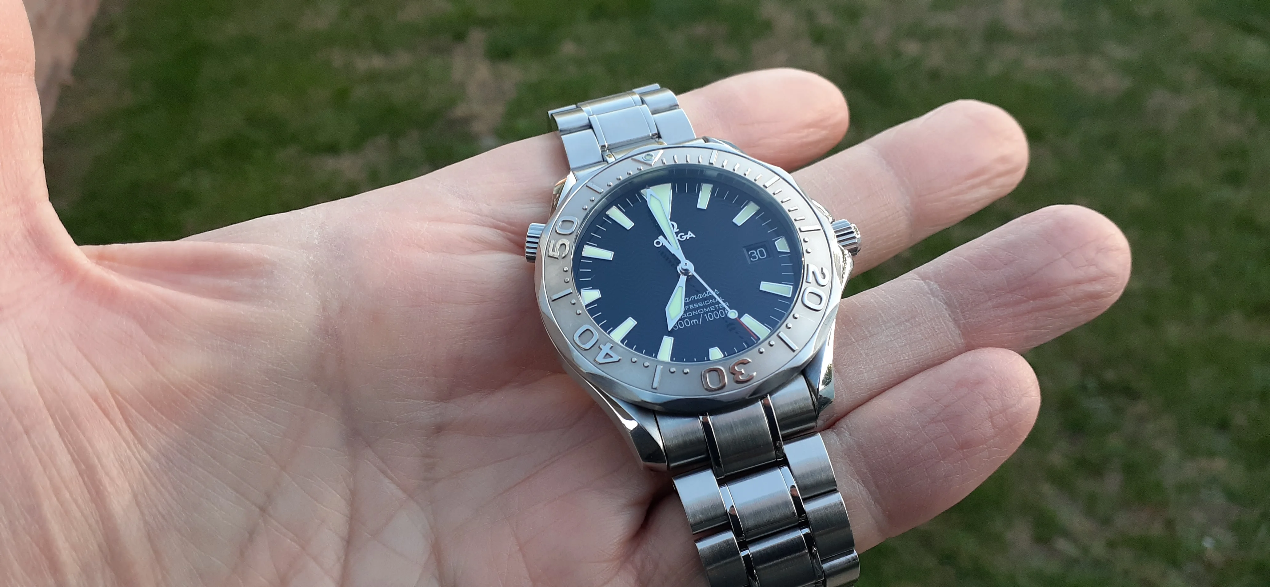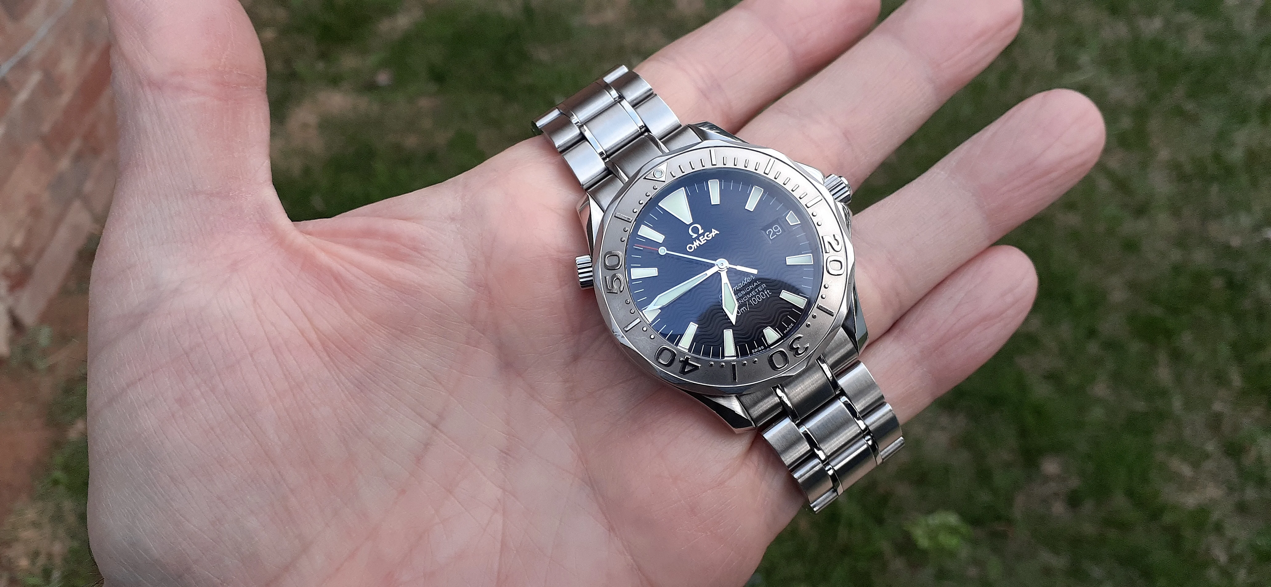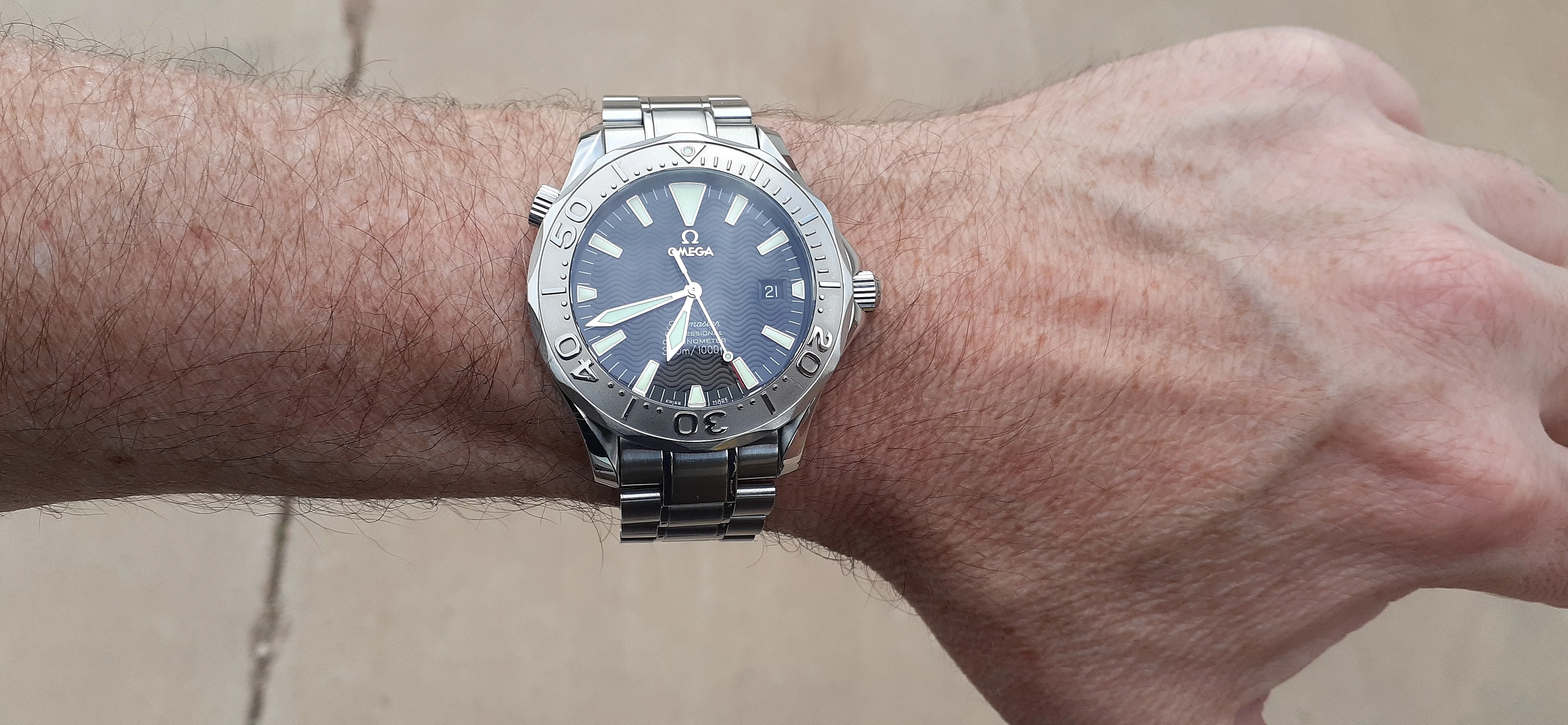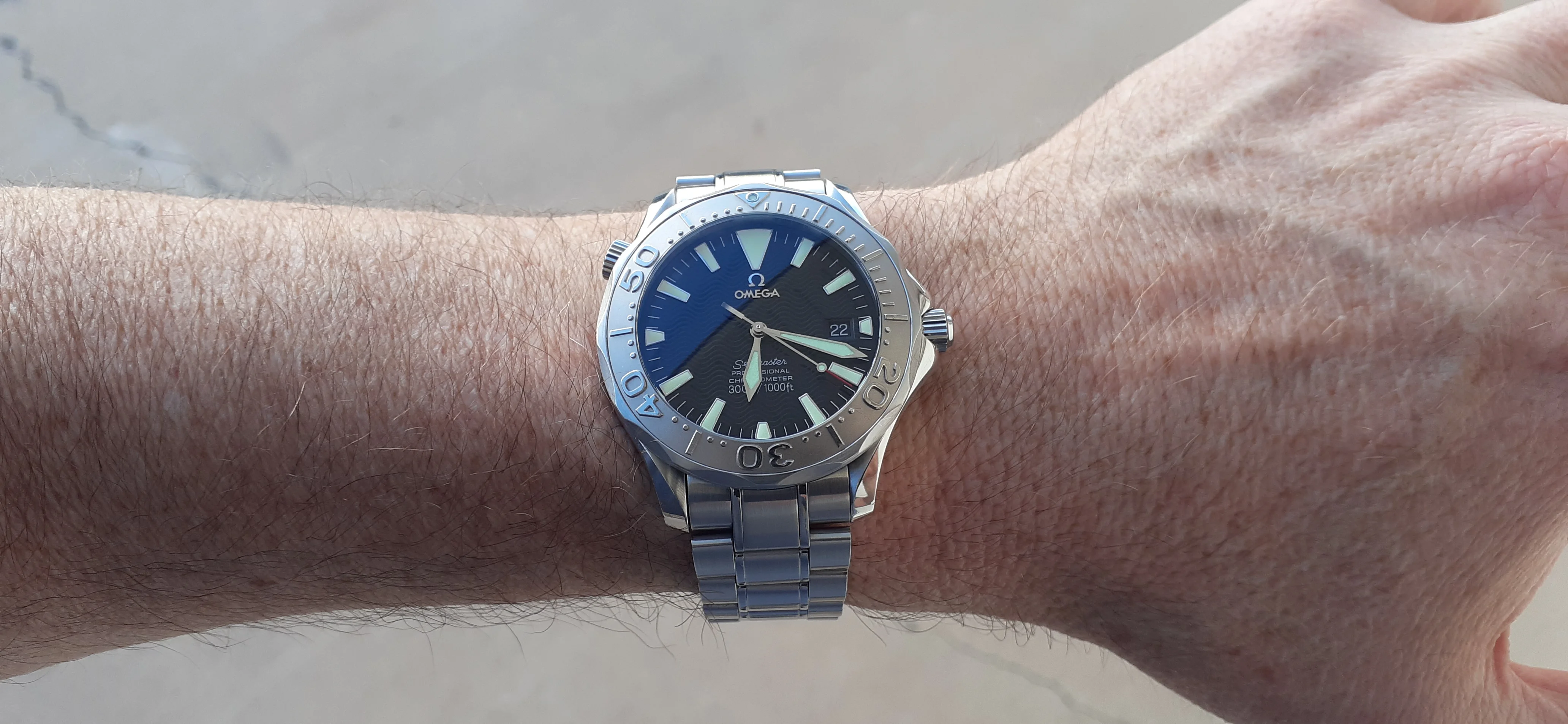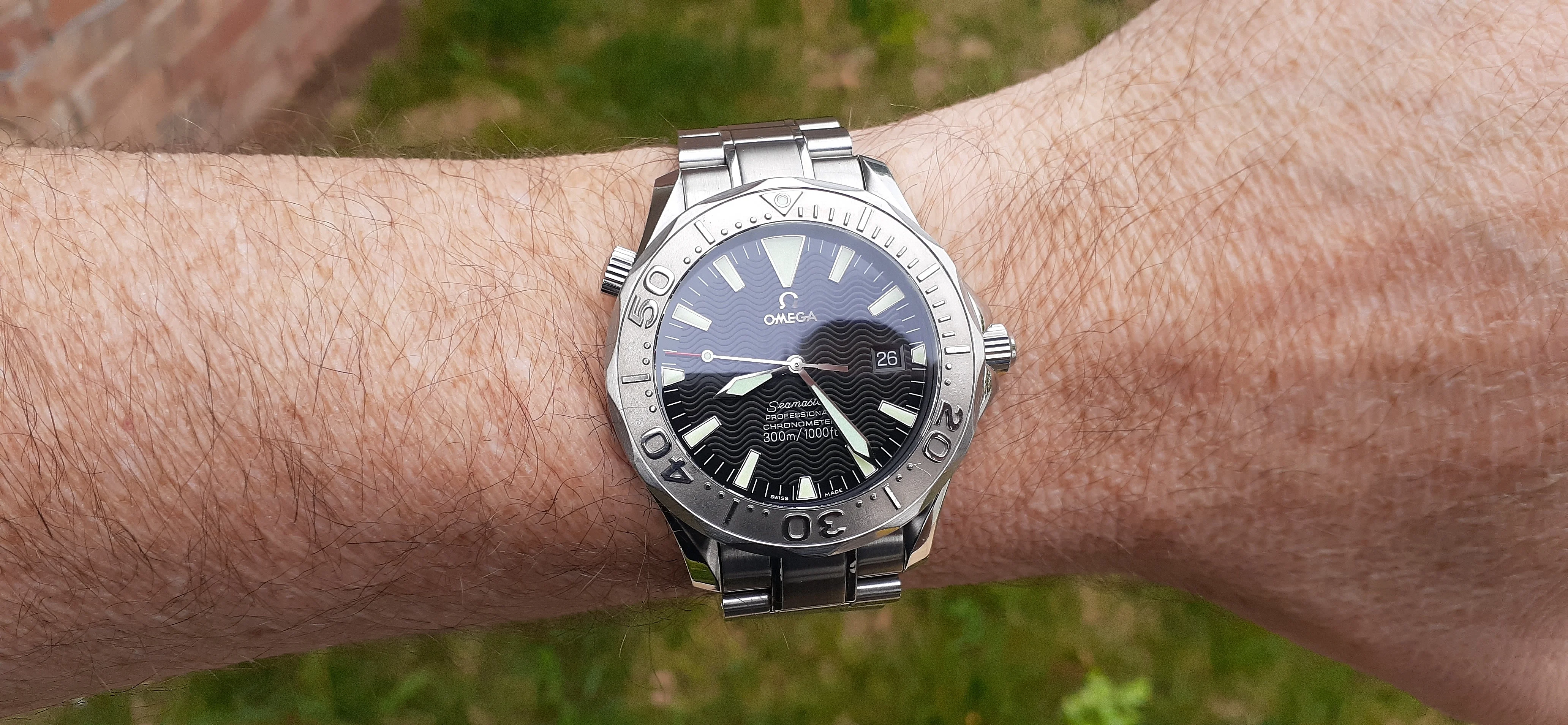 ·I am selling my Omega Seamaster 2230.50 "Non-America's Cup" Please look at the photos for condition. I bought it from Watch Vault NYC two or three years ago and as far as I know, it hasn't been serviced (there is even some of the red wax on the back of the case.) I timed it with WatchCheck over a week and it is averaging +7.4 sec per day. It is a great looking watch but it does have micro-scratches everywhere (I took a lot of photos today in harsh lighting to show it at it's worst) and a few deeper dings. Comes with the chronometer card, warranty card, bibliography card, three full links and one half-link only.