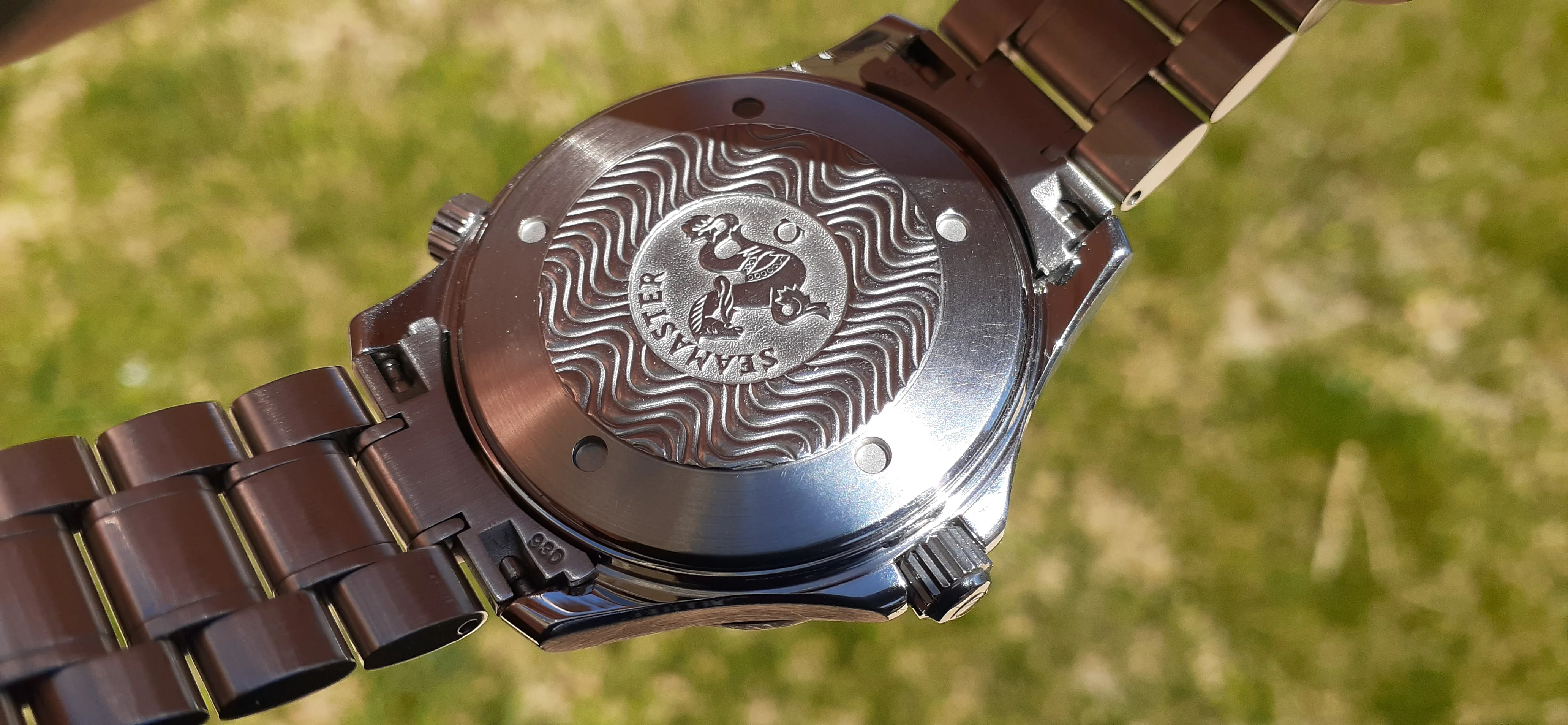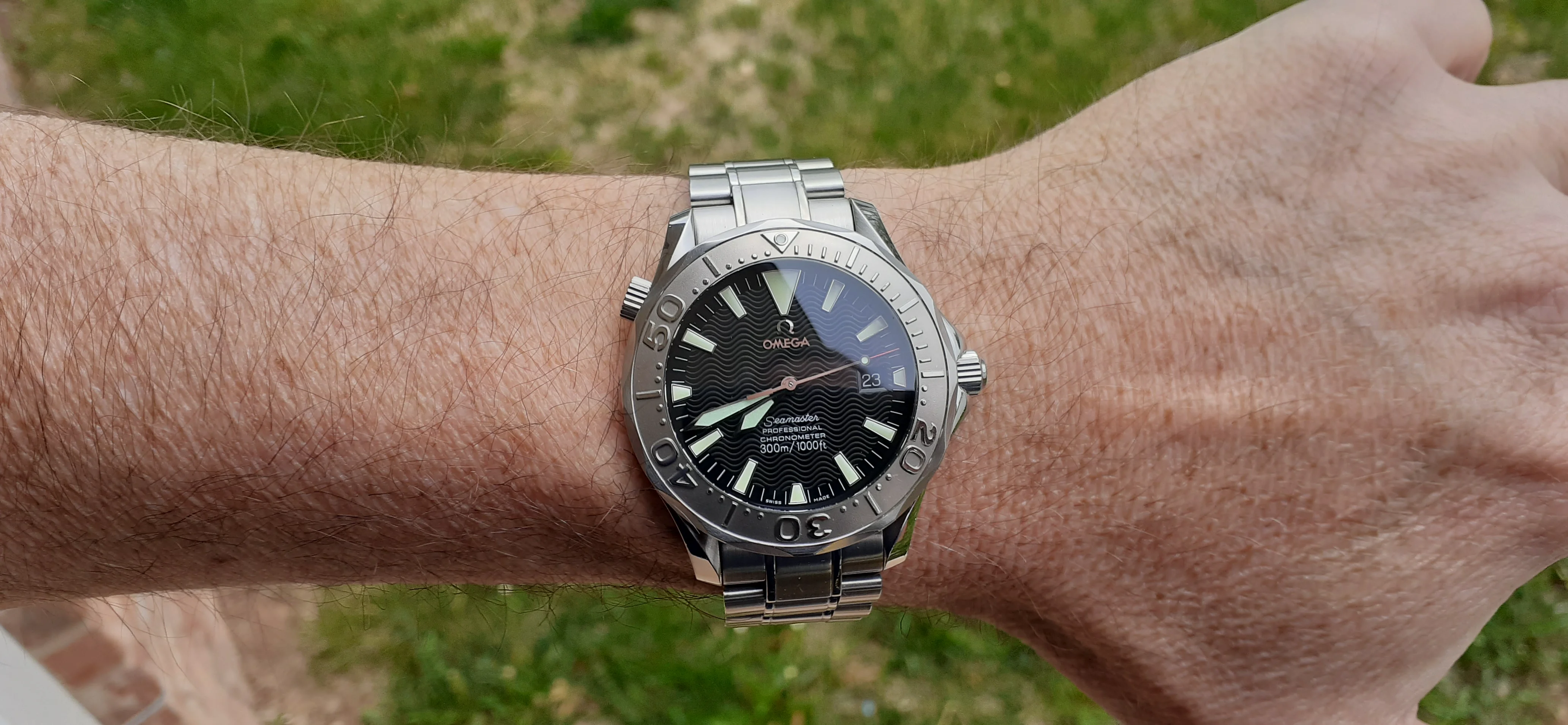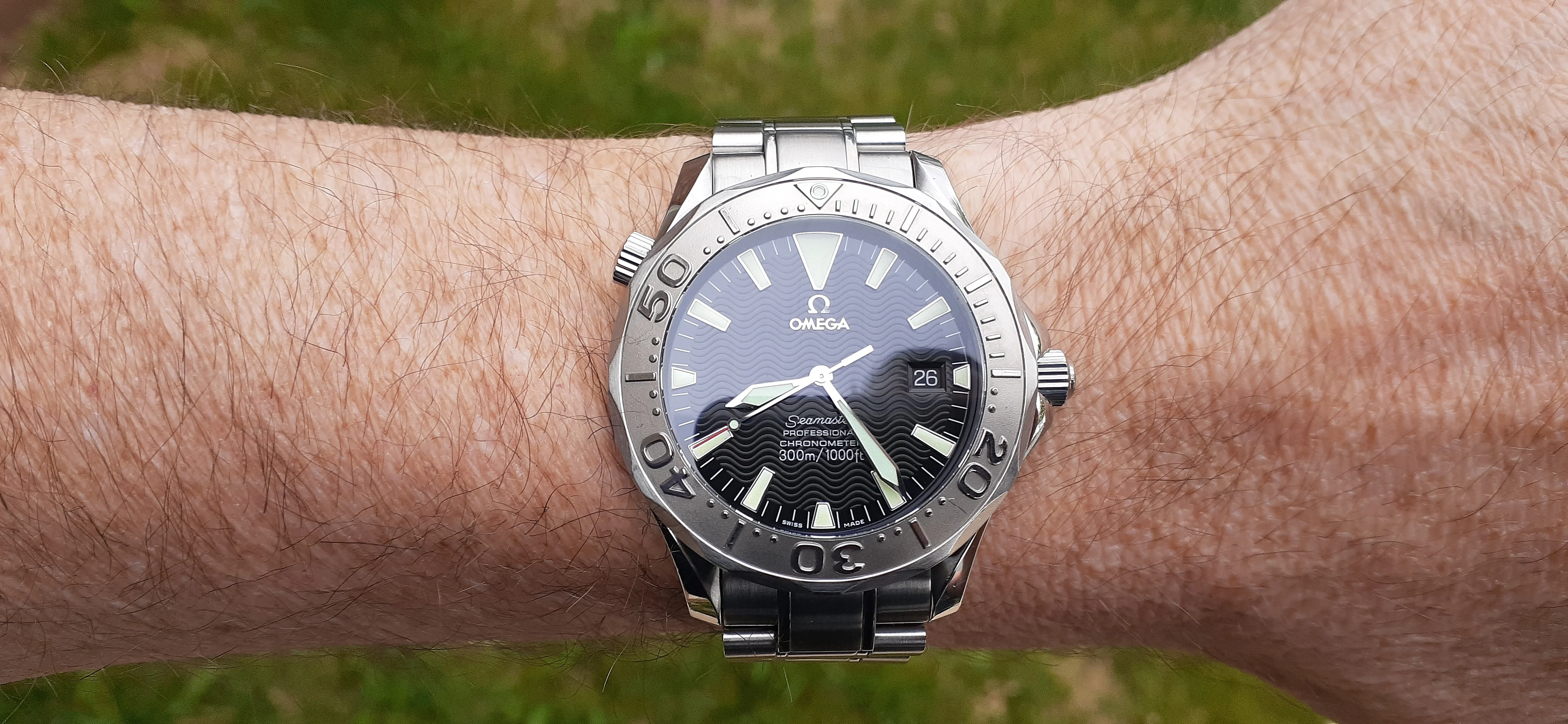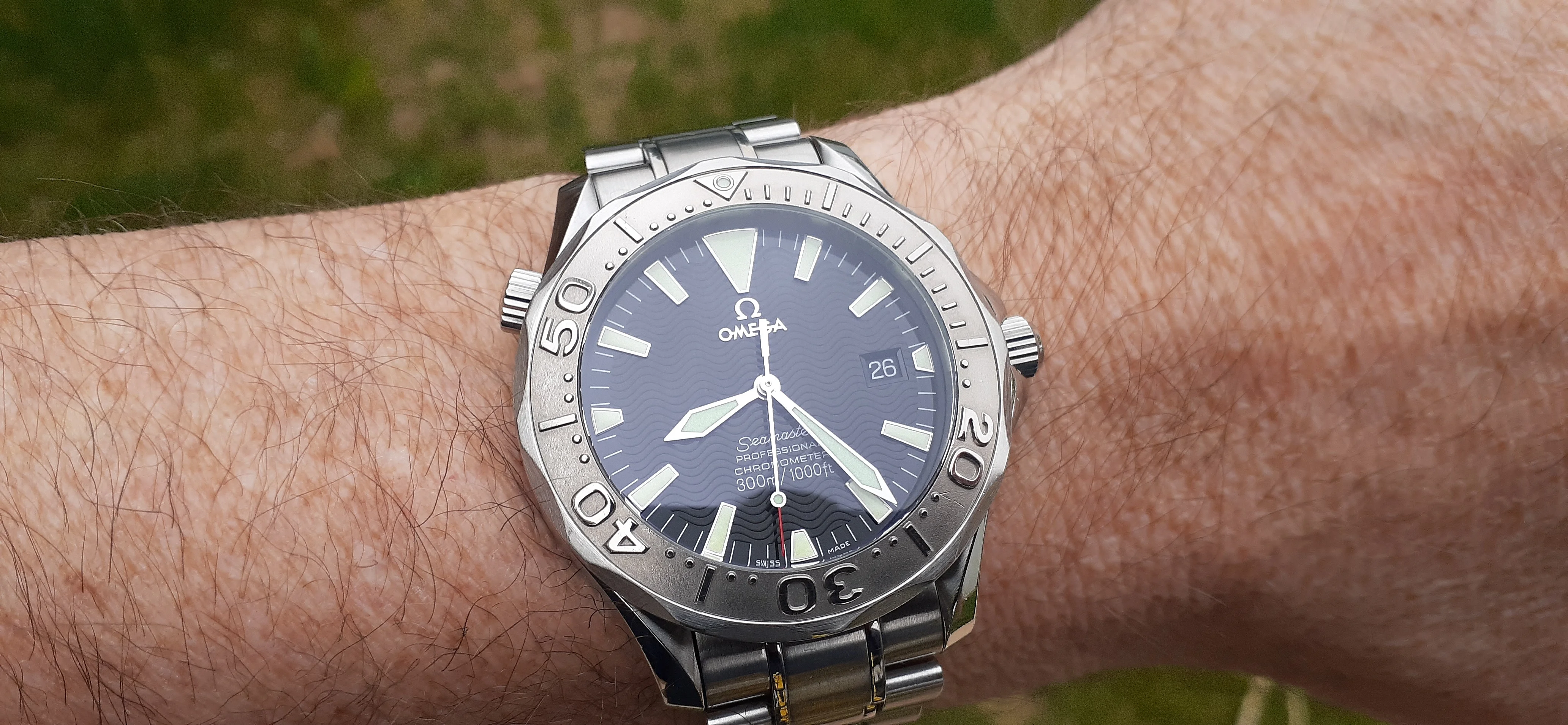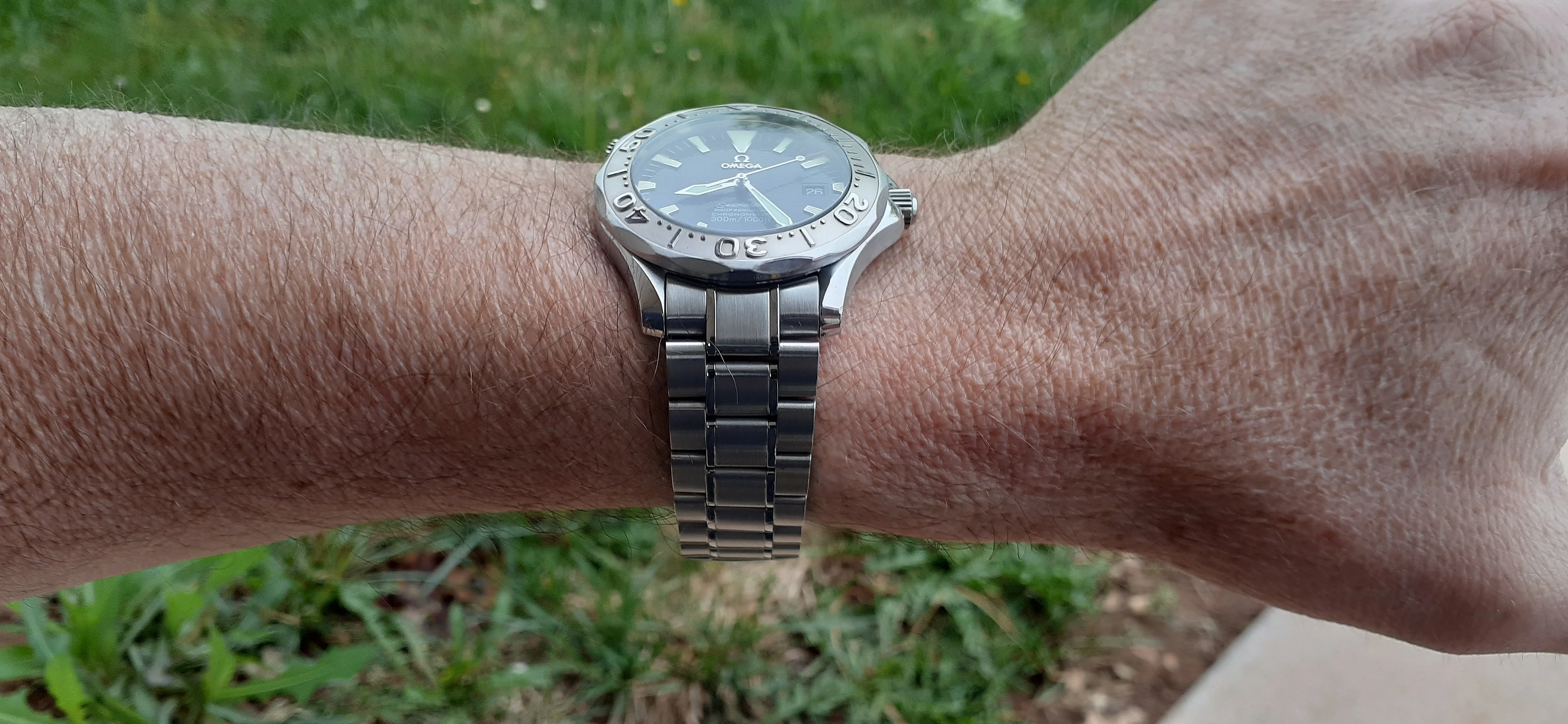·I am selling my Omega Seamaster 2230.50 "Non-America's Cup" Please look at the photos for condition. I bought it from Watch Vault NYC two or three years ago and as far as I know, it hasn't been serviced (there is even some of the red wax on the back of the case.) I timed it with WatchCheck over a week and it is averaging +7.4 sec per day. It is a great looking watch but it does have micro-scratches everywhere (I took a lot of photos today in harsh lighting to show it at it's worst) and a few deeper dings. Comes with the chronometer card, warranty card, bibliography card, three full links and one half-link only.