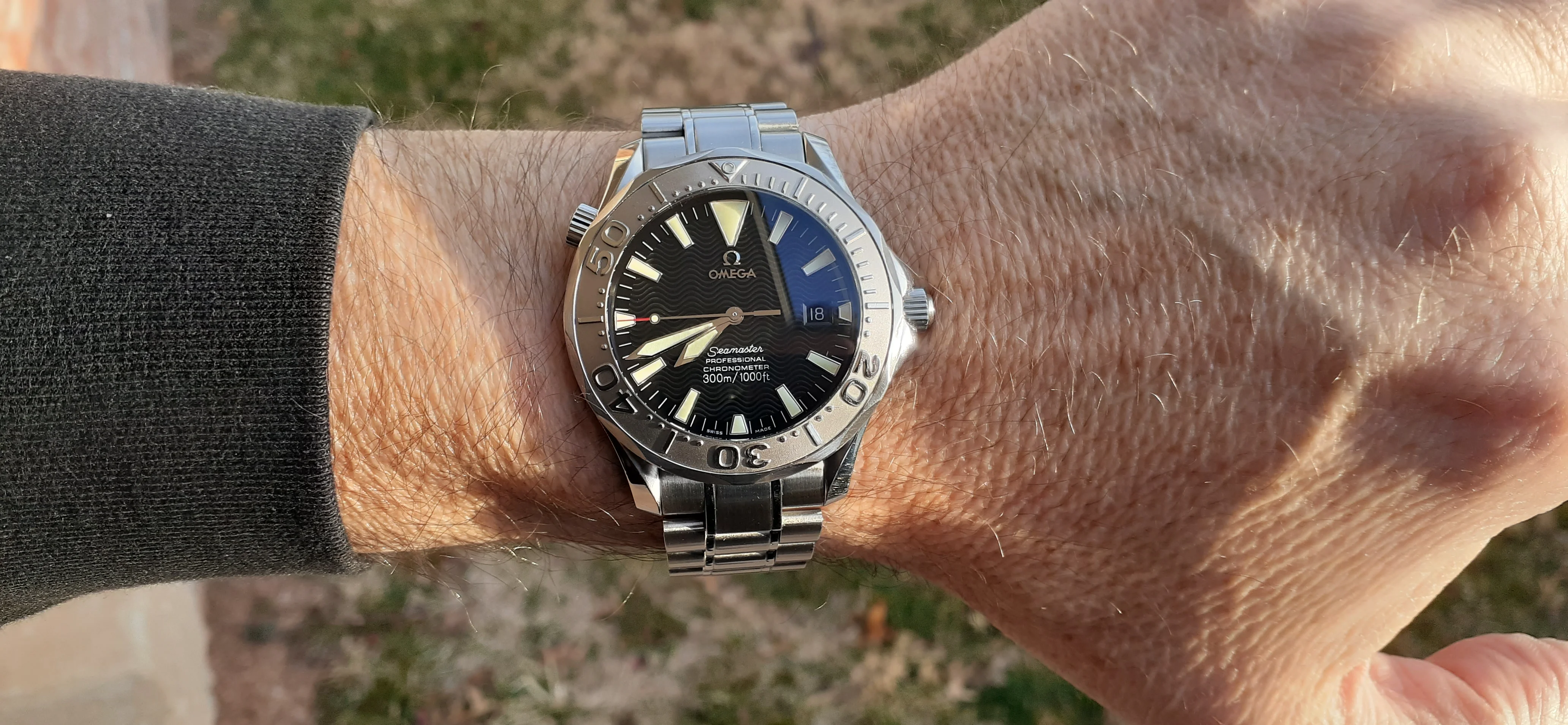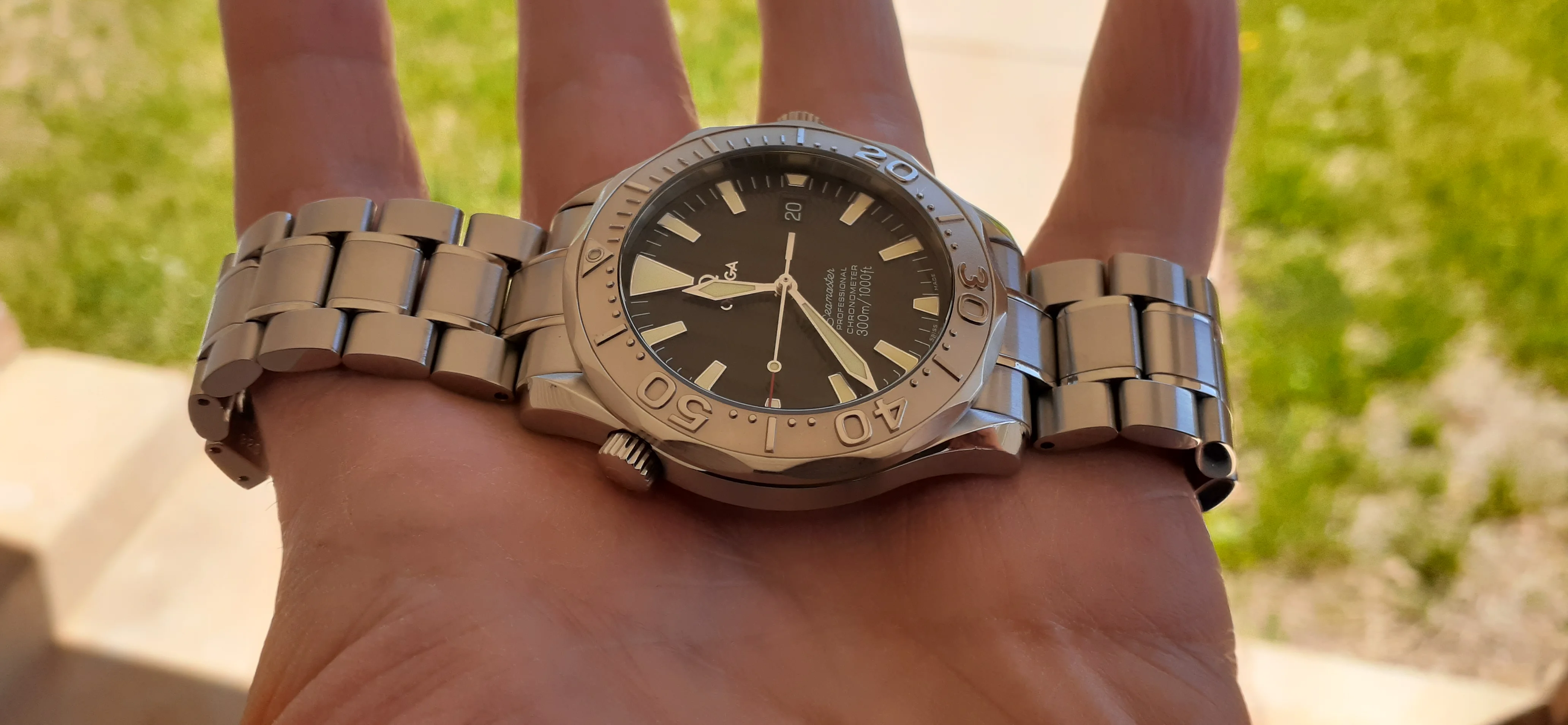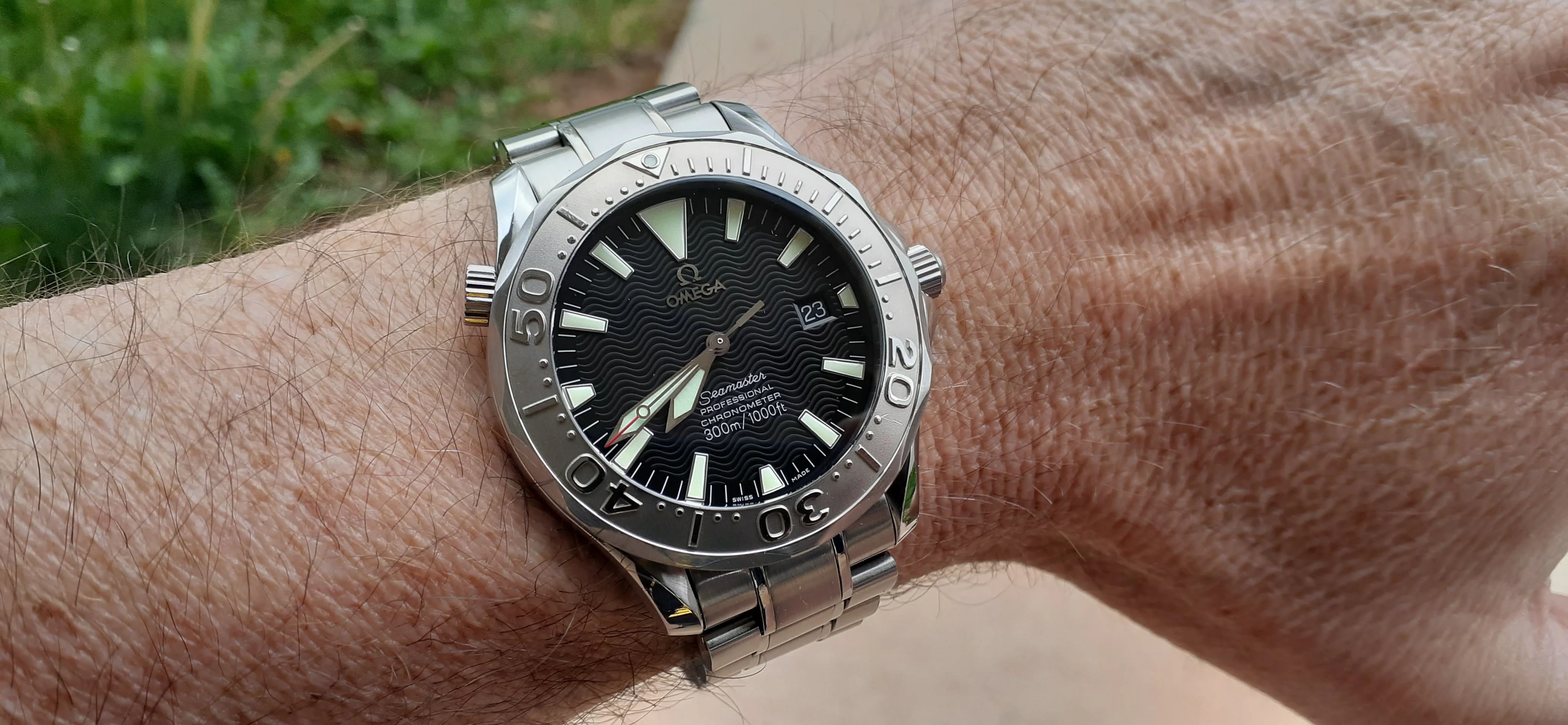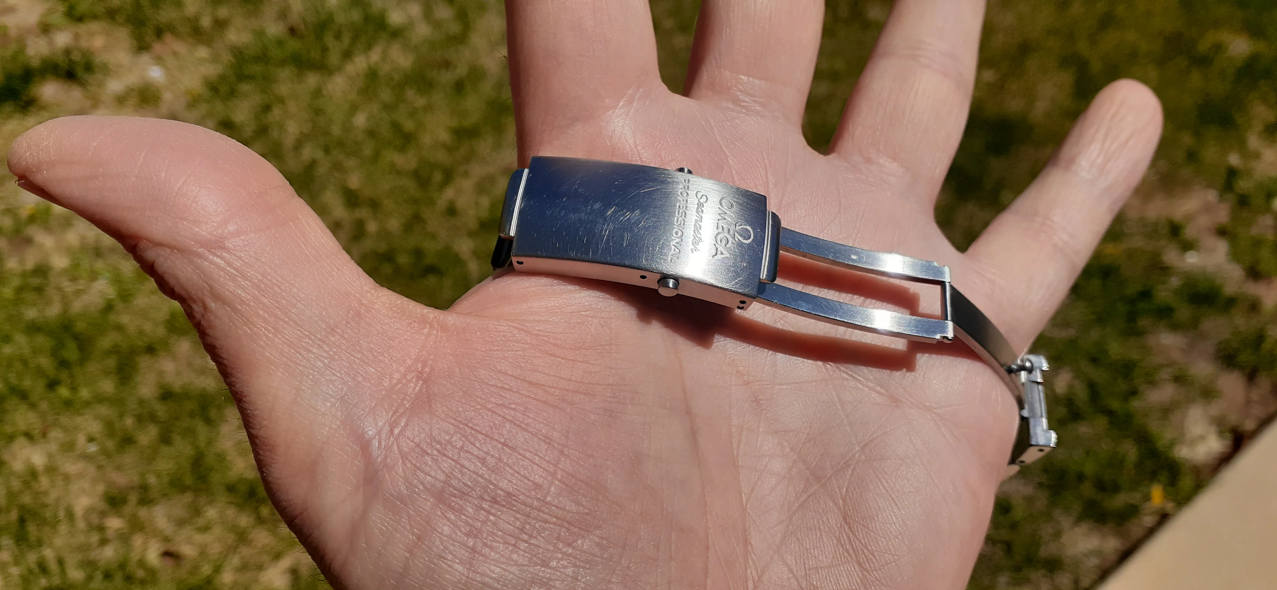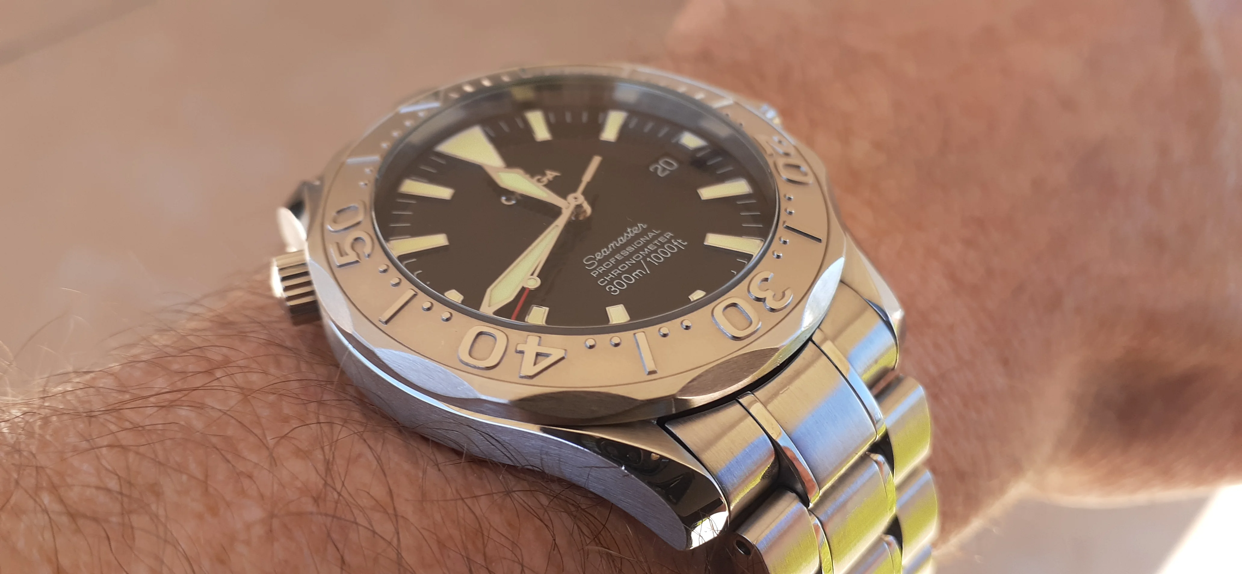 ·I am selling my Omega Seamaster 2230.50 "Non-America's Cup" Please look at the photos for condition. I bought it from Watch Vault NYC two or three years ago and as far as I know, it hasn't been serviced (there is even some of the red wax on the back of the case.) I timed it with WatchCheck over a week and it is averaging +7.4 sec per day. It is a great looking watch but it does have micro-scratches everywhere (I took a lot of photos today in harsh lighting to show it at it's worst) and a few deeper dings. Comes with the chronometer card, warranty card, bibliography card, three full links and one half-link only.