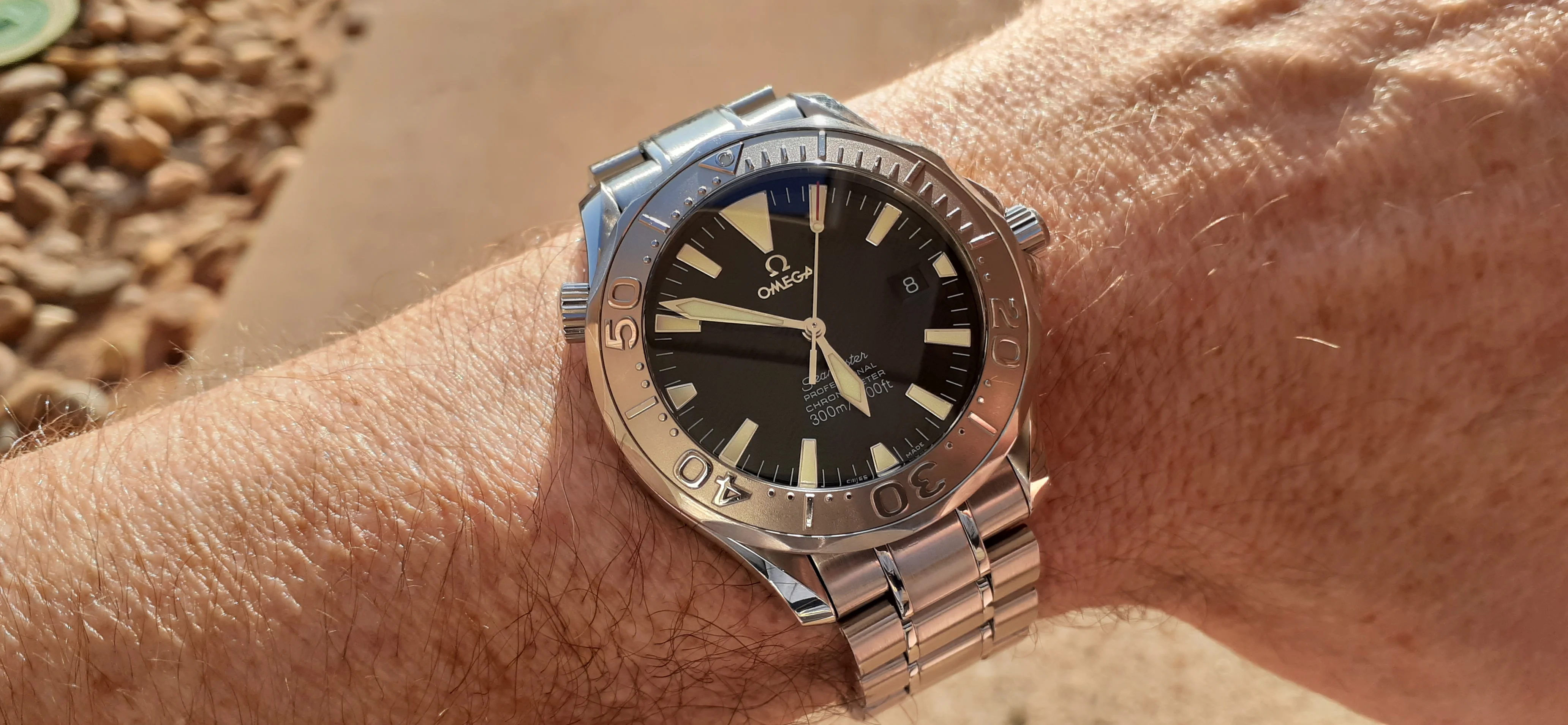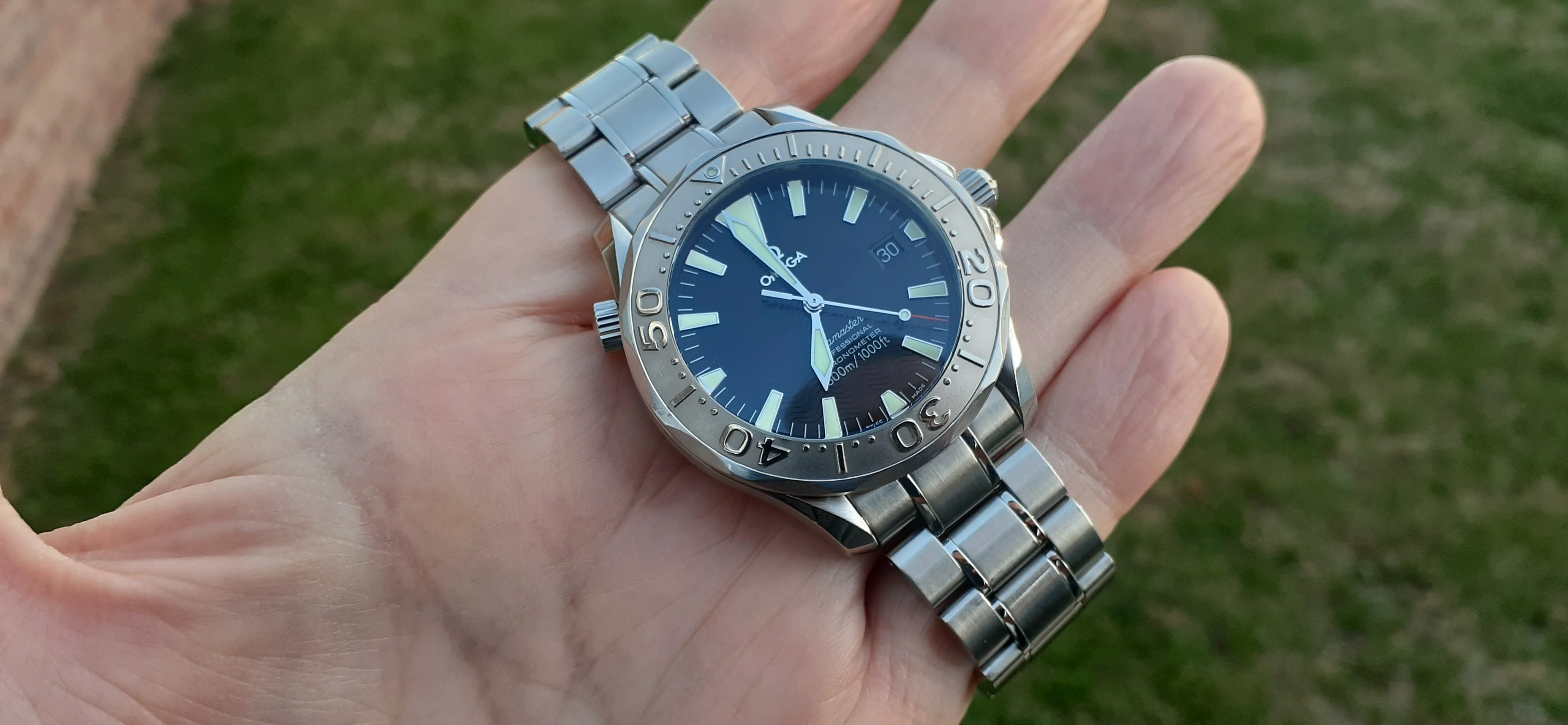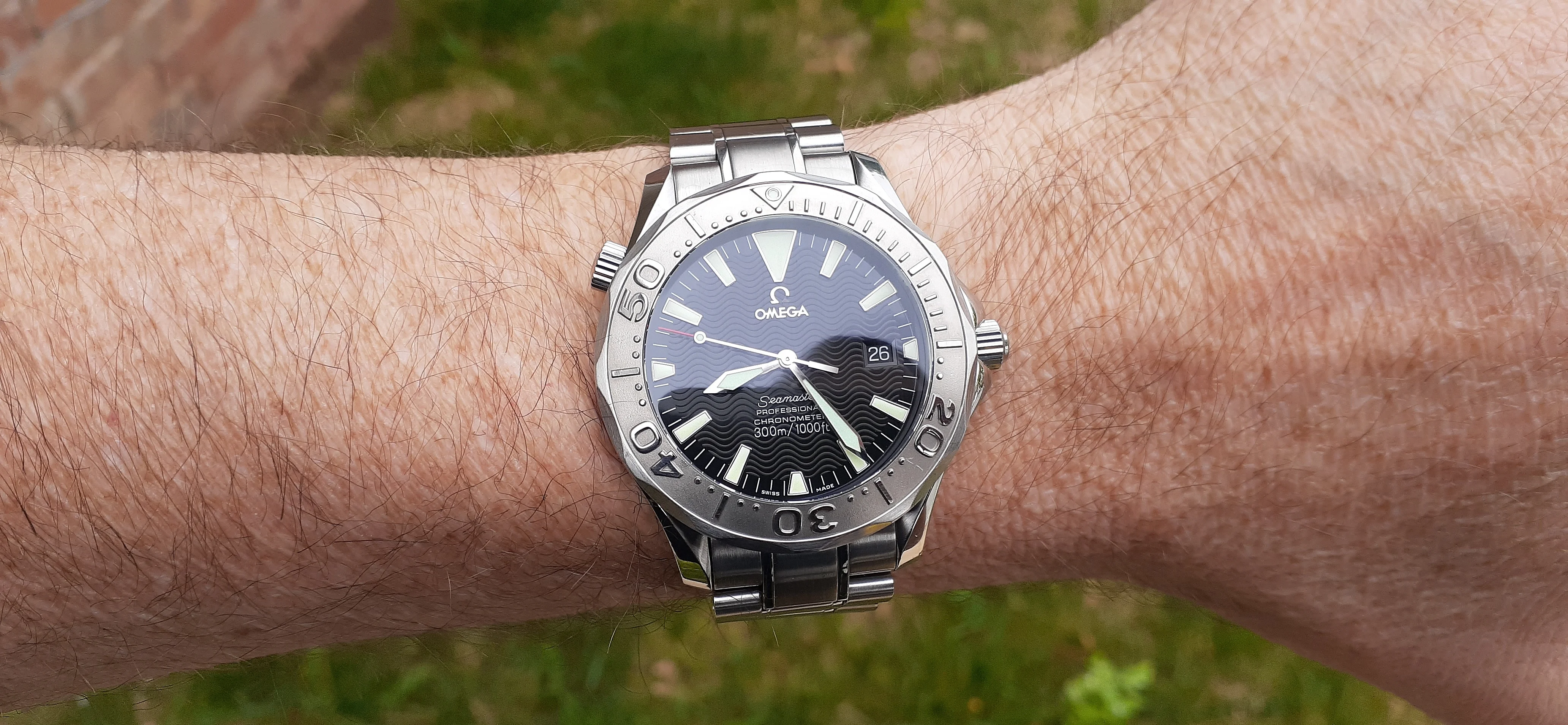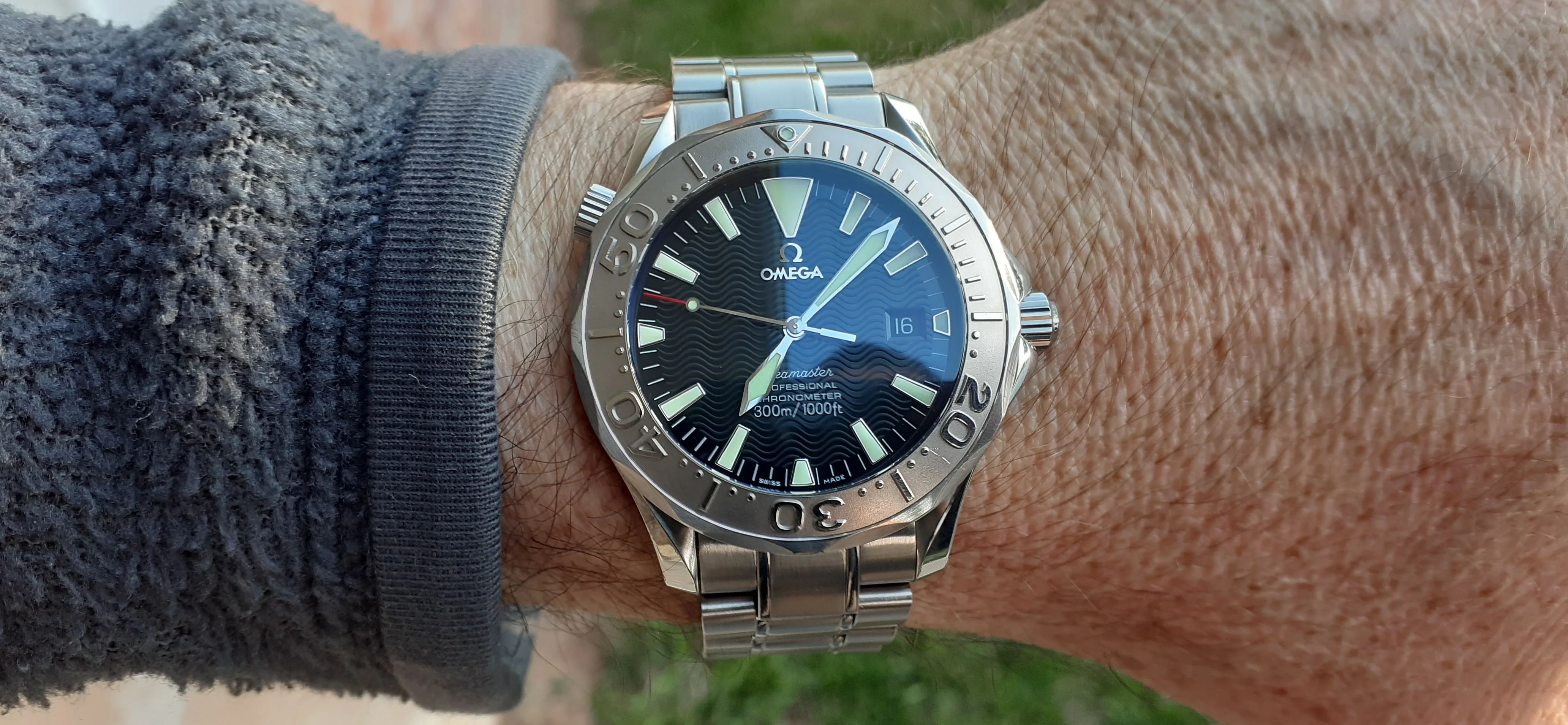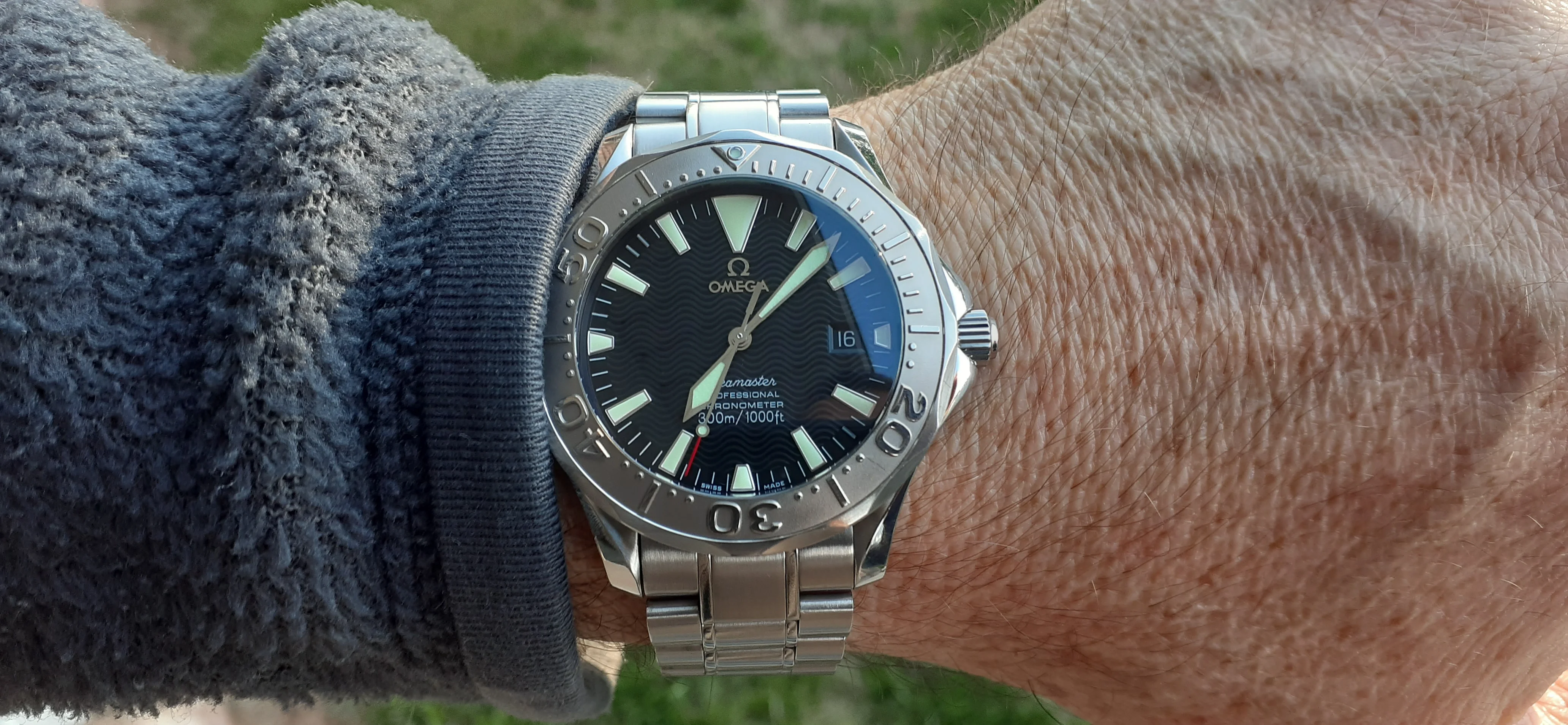 ·I am selling my Omega Seamaster 2230.50 "Non-America's Cup" Please look at the photos for condition. I bought it from Watch Vault NYC two or three years ago and as far as I know, it hasn't been serviced (there is even some of the red wax on the back of the case.) I timed it with WatchCheck over a week and it is averaging +7.4 sec per day. It is a great looking watch but it does have micro-scratches everywhere (I took a lot of photos today in harsh lighting to show it at it's worst) and a few deeper dings. Comes with the chronometer card, warranty card, bibliography card, three full links and one half-link only.