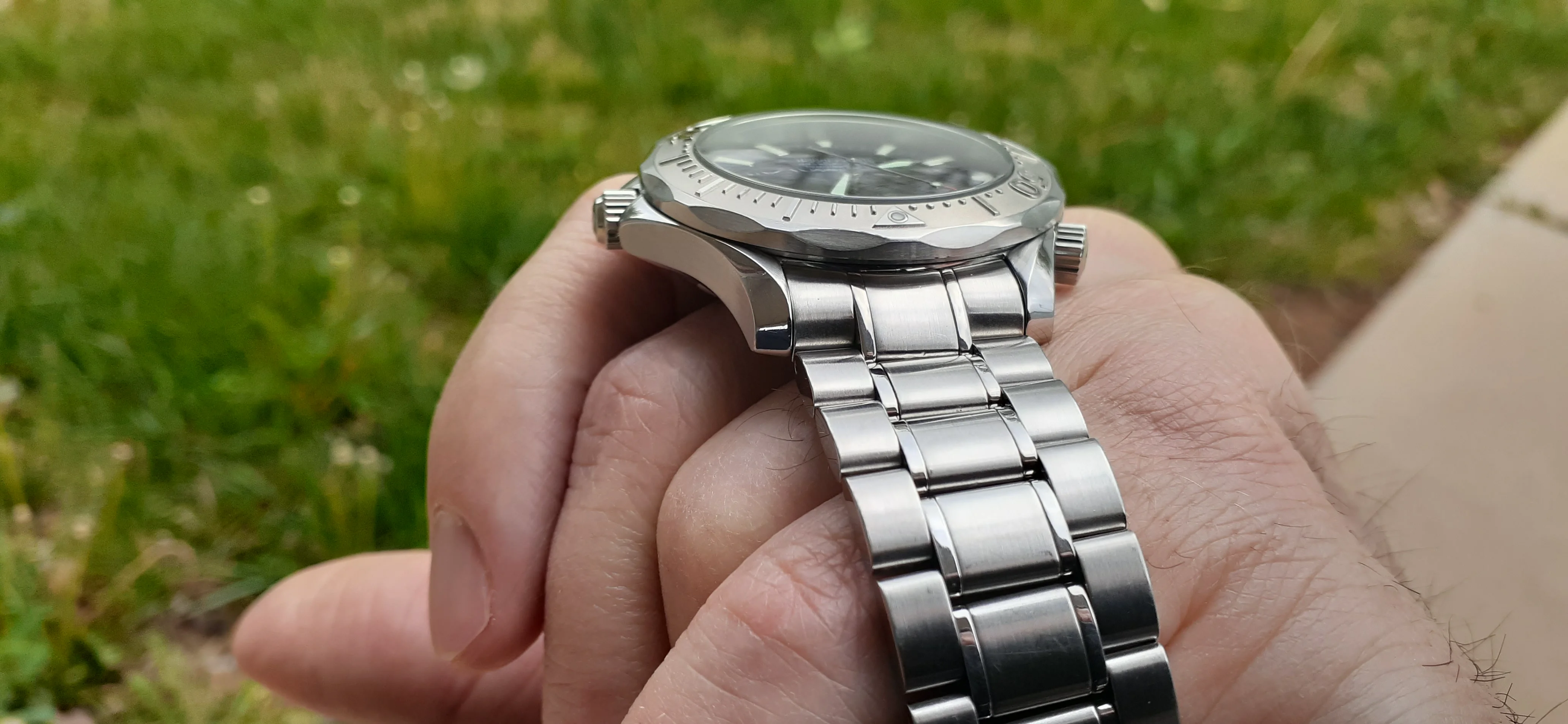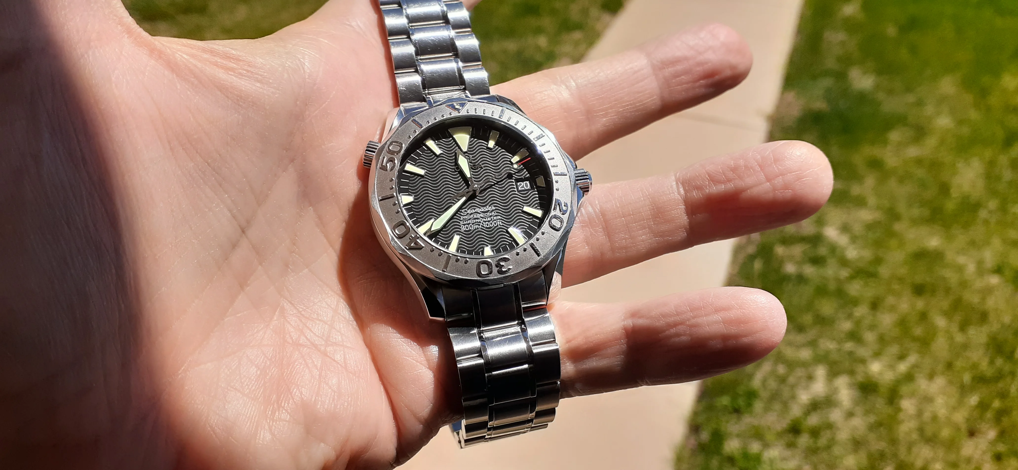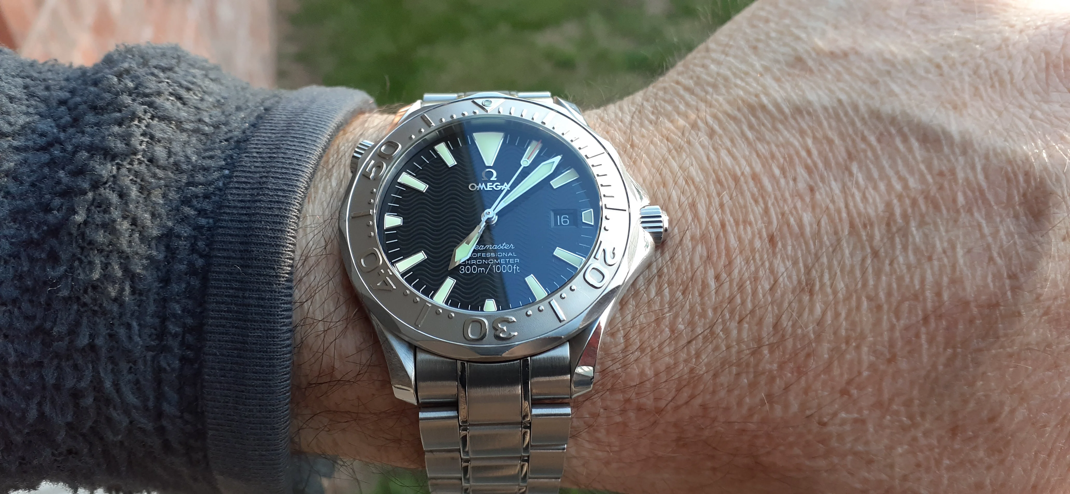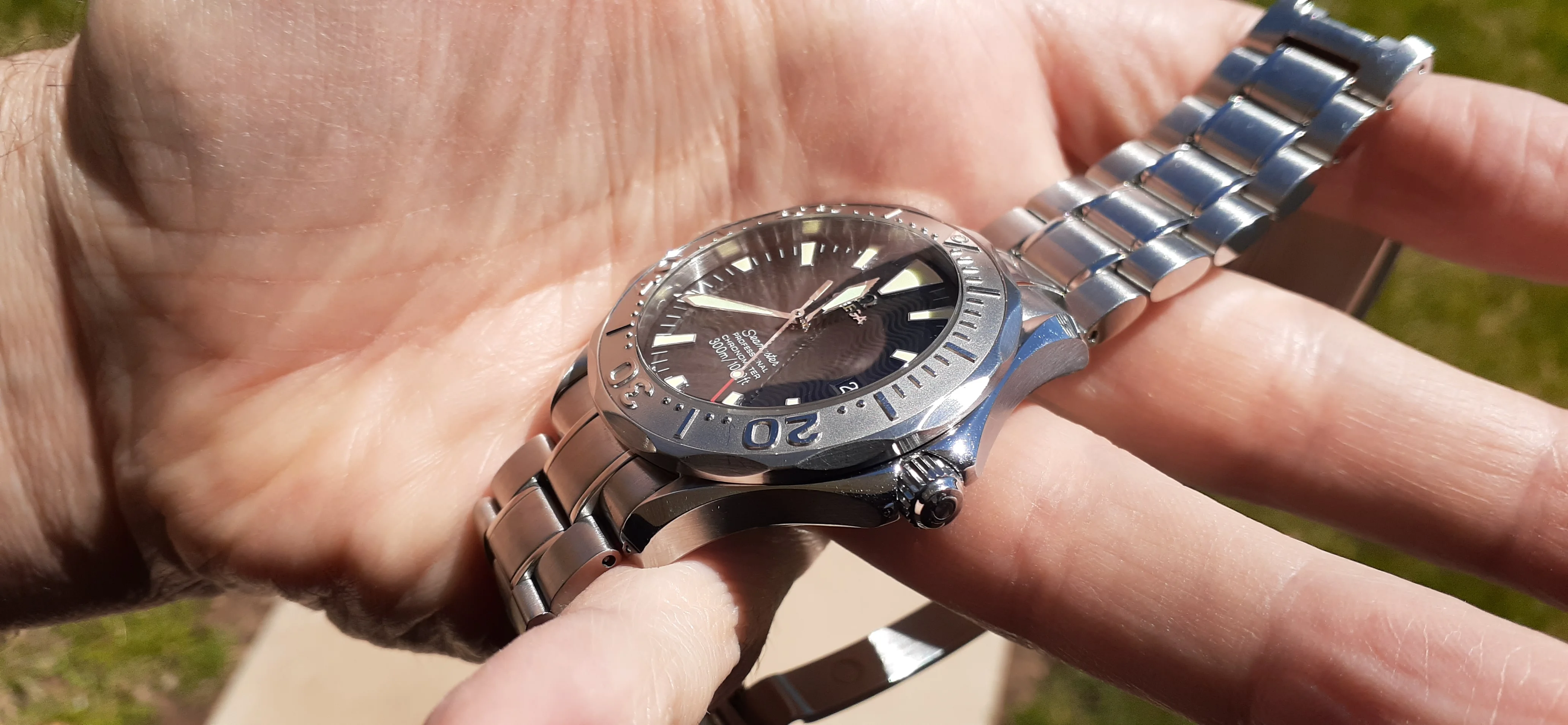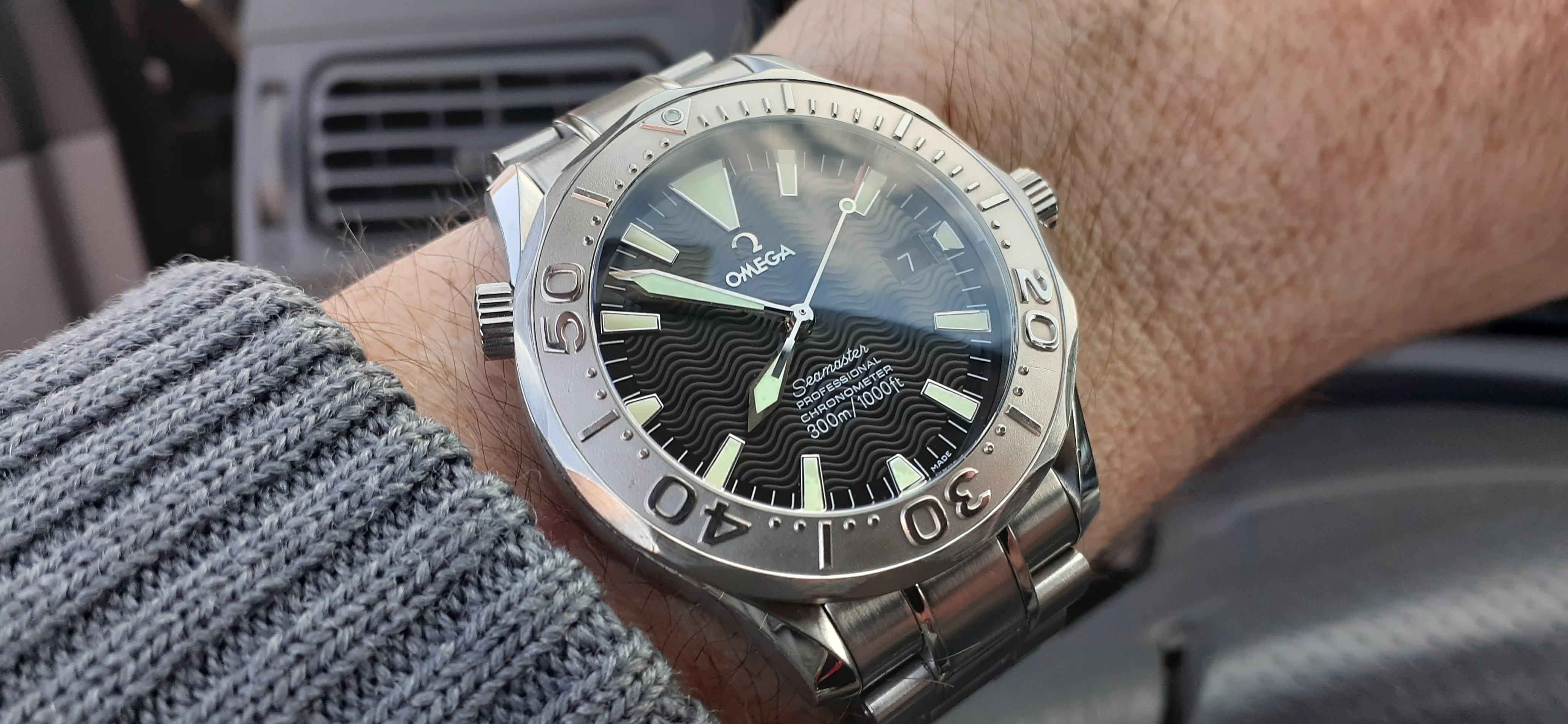 ·I am selling my Omega Seamaster 2230.50 "Non-America's Cup" Please look at the photos for condition. I bought it from Watch Vault NYC two or three years ago and as far as I know, it hasn't been serviced (there is even some of the red wax on the back of the case.) I timed it with WatchCheck over a week and it is averaging +7.4 sec per day. It is a great looking watch but it does have micro-scratches everywhere (I took a lot of photos today in harsh lighting to show it at it's worst) and a few deeper dings. Comes with the chronometer card, warranty card, bibliography card, three full links and one half-link only.