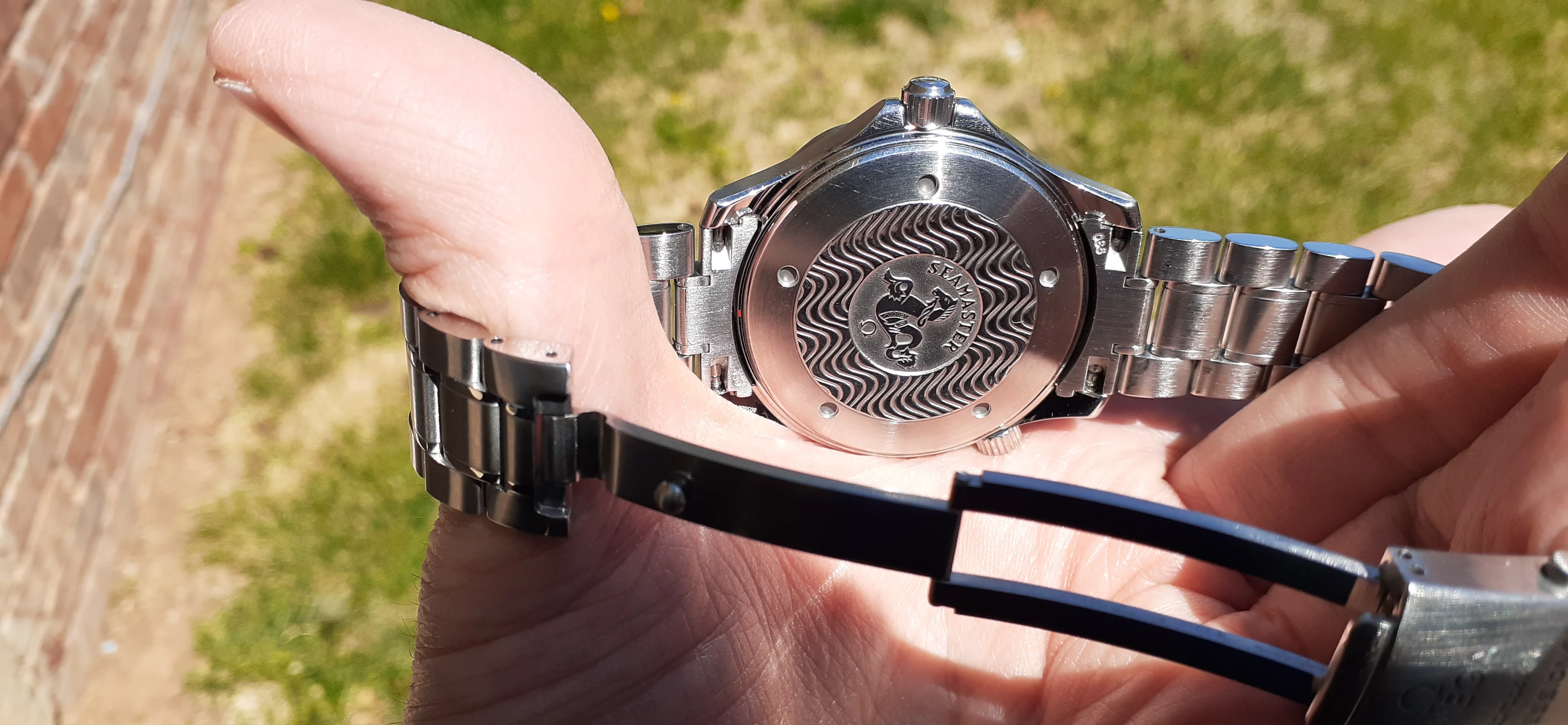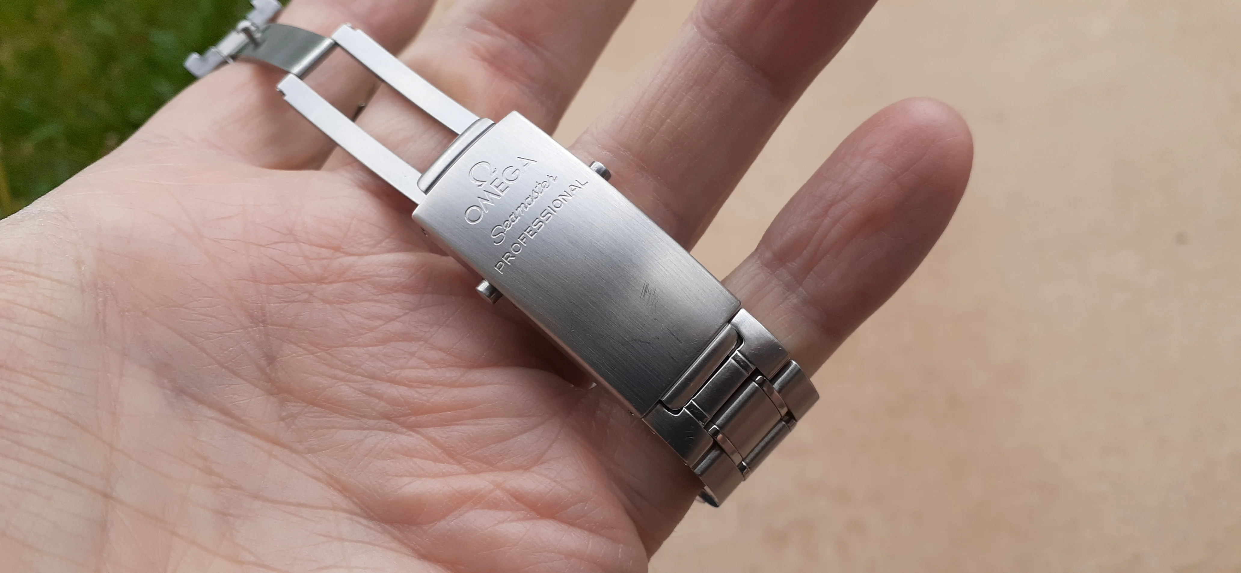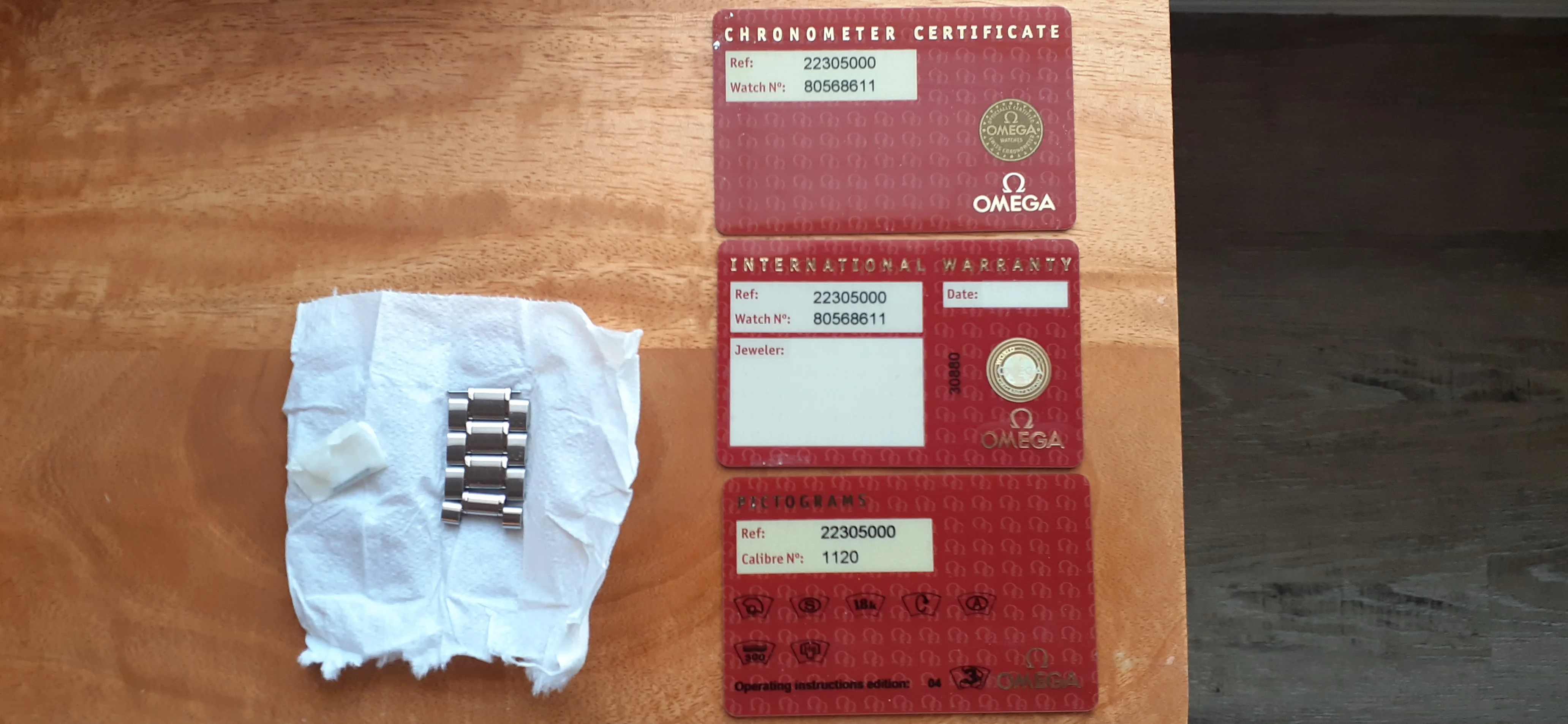 I am selling my Omega Seamaster 2230.50 "Non-America's Cup" Please look at the photos for condition. I bought it from Watch Vault NYC two or three years ago and as far as I know, it hasn't been serviced (there is even some of the red wax on the back of the case.) I timed it with WatchCheck over a week and it is averaging +7.4 sec per day. It is a great looking watch but it does have micro-scratches everywhere (I took a lot of photos today in harsh lighting to show it at it's worst) and a few deeper dings. Comes with the chronometer card, warranty card, bibliography card, three full links and one half-link only.