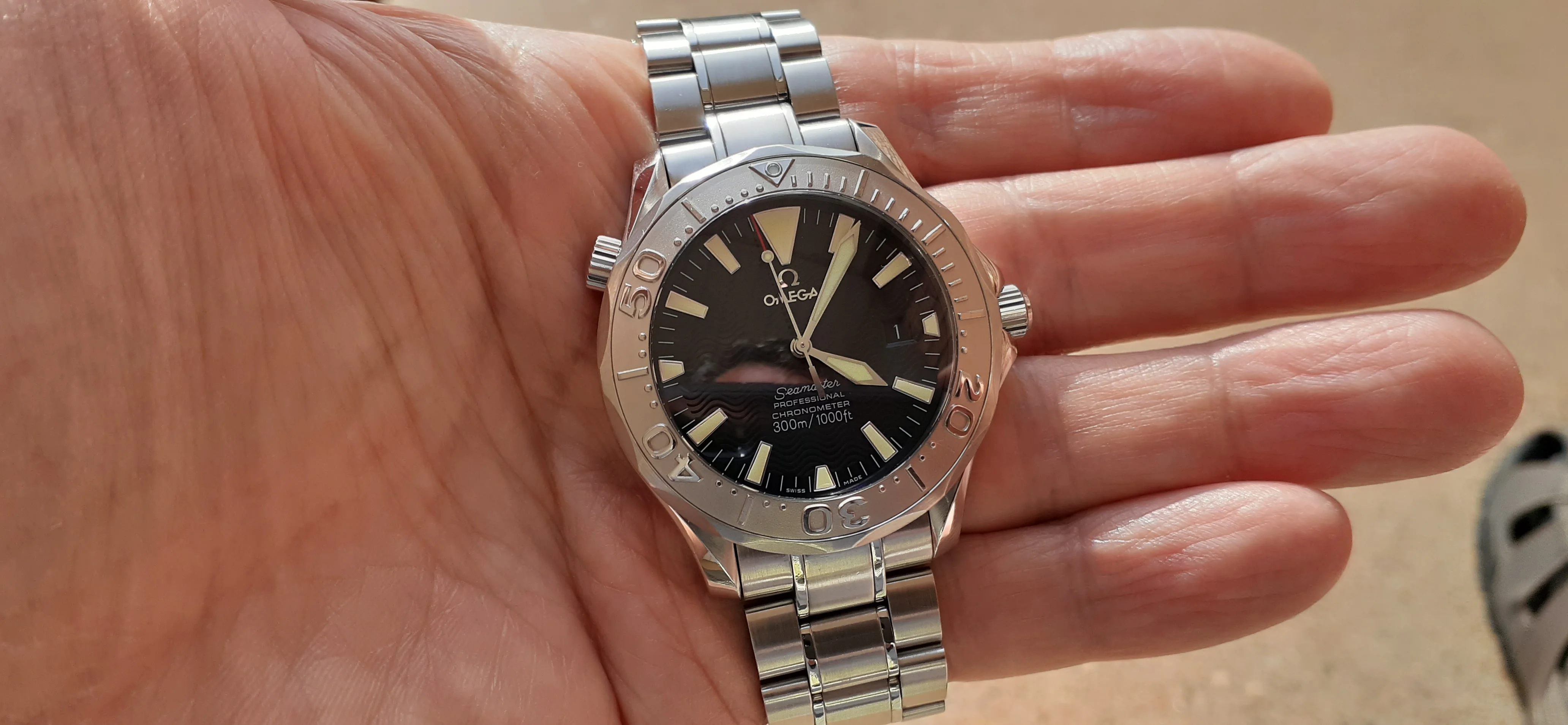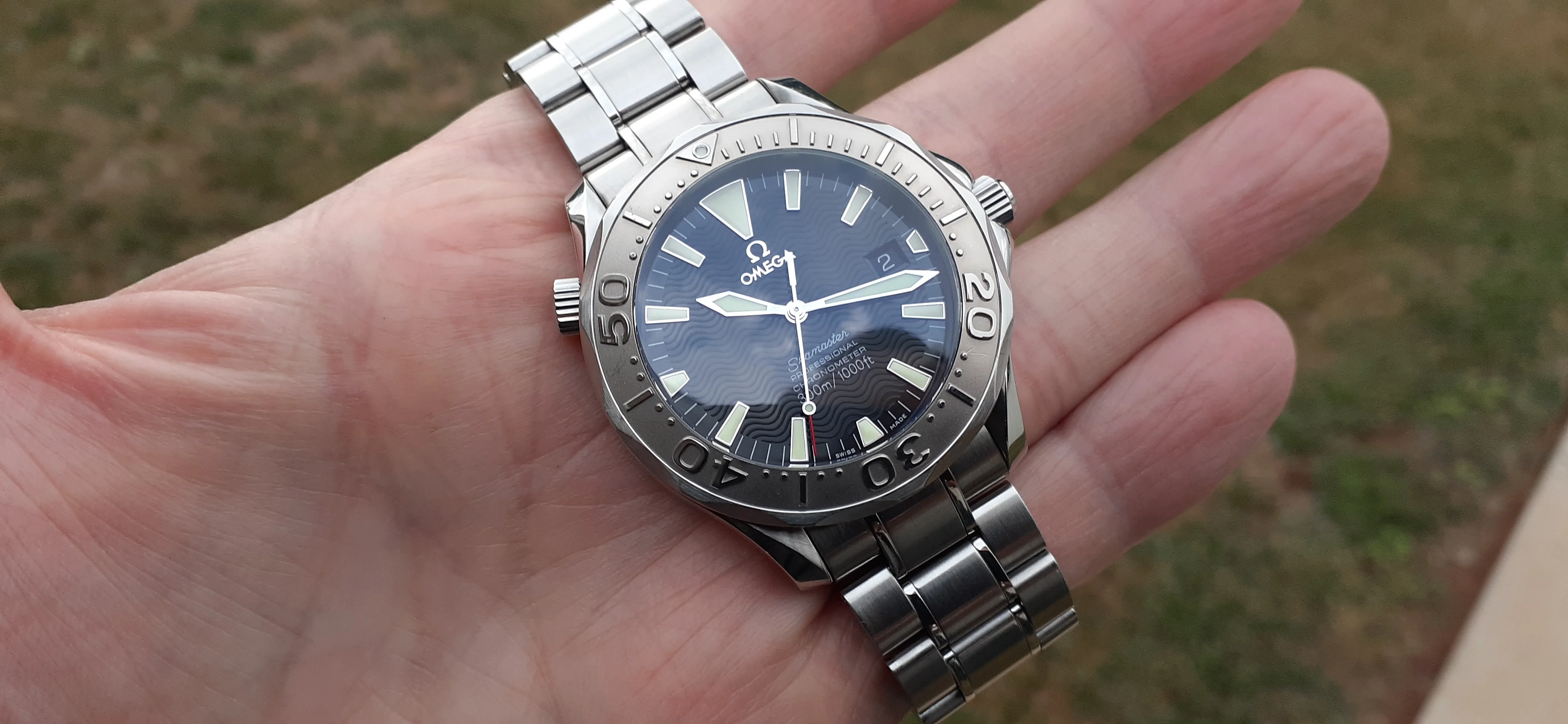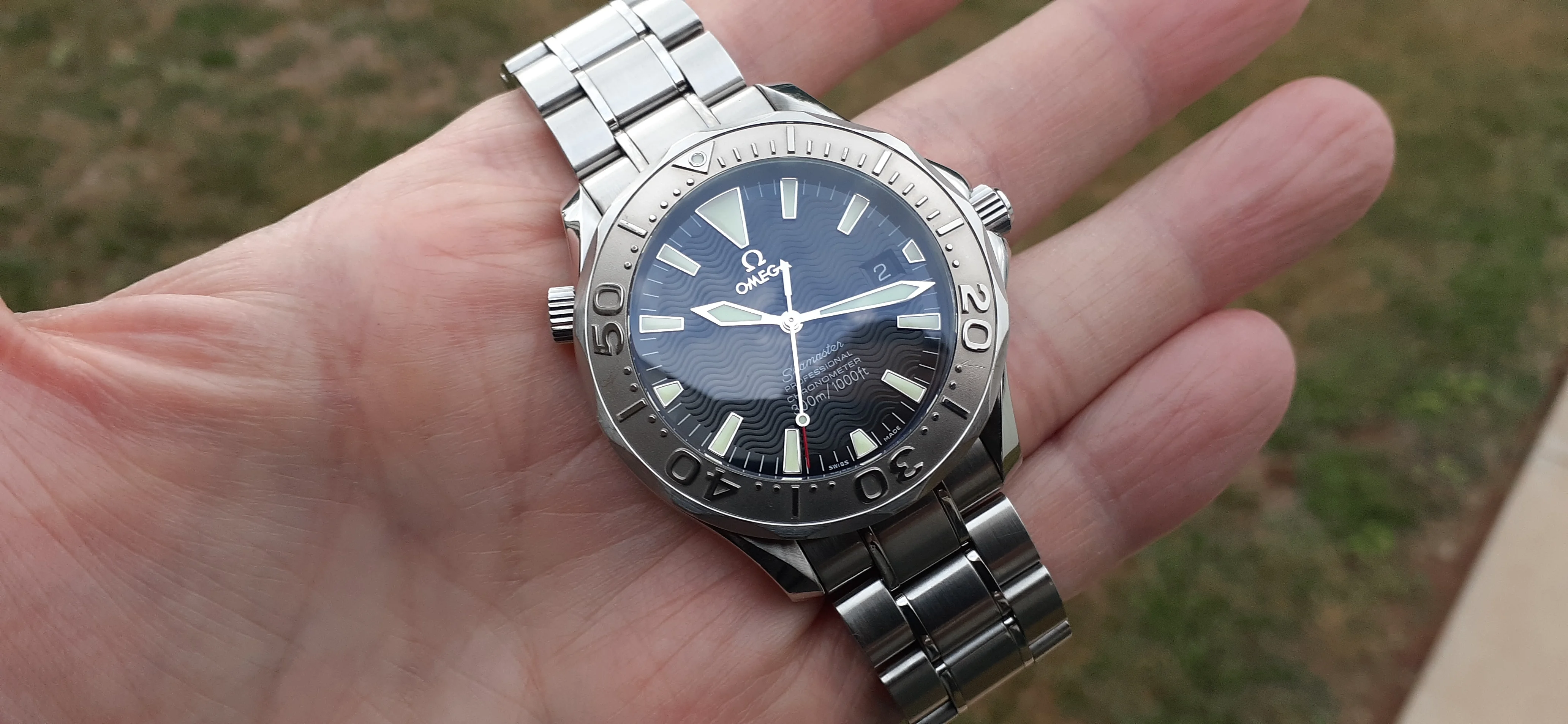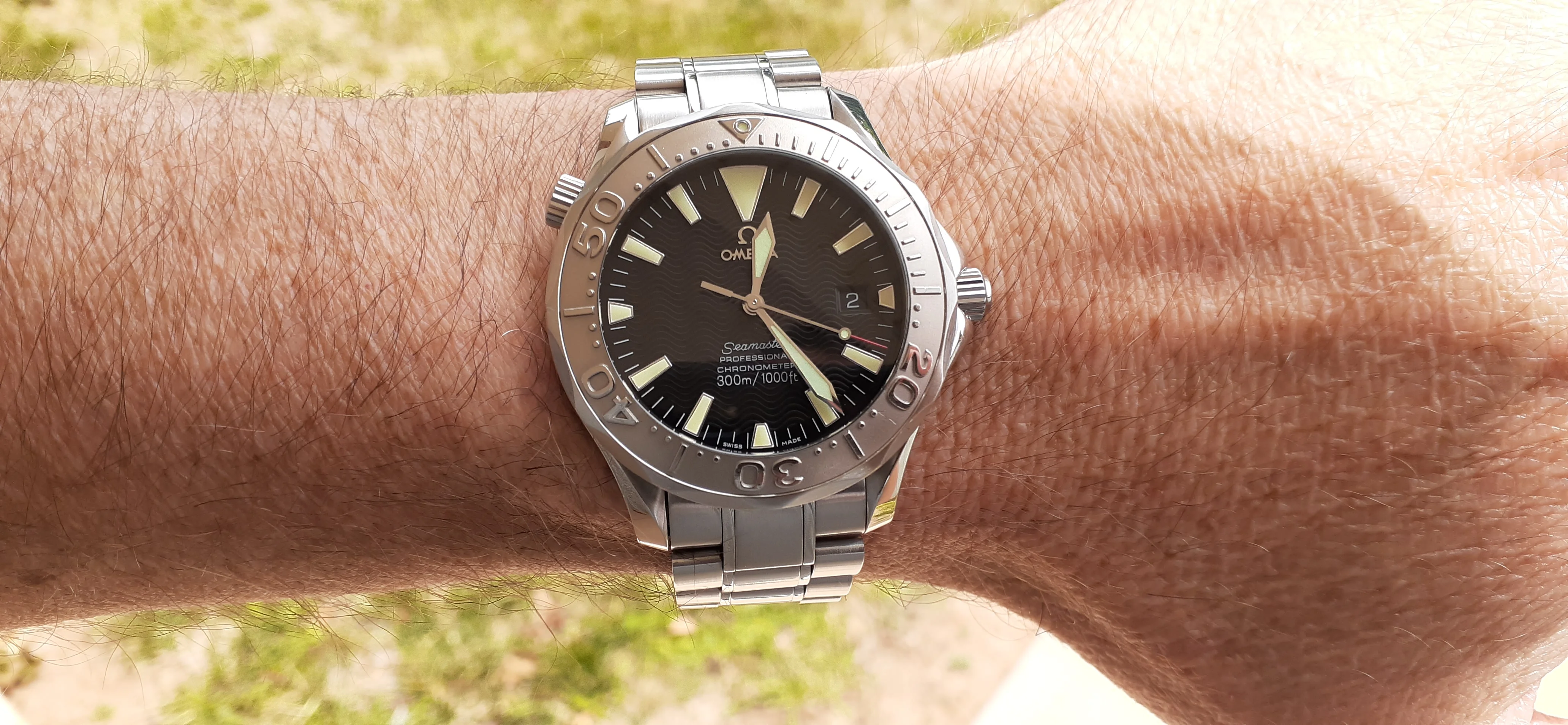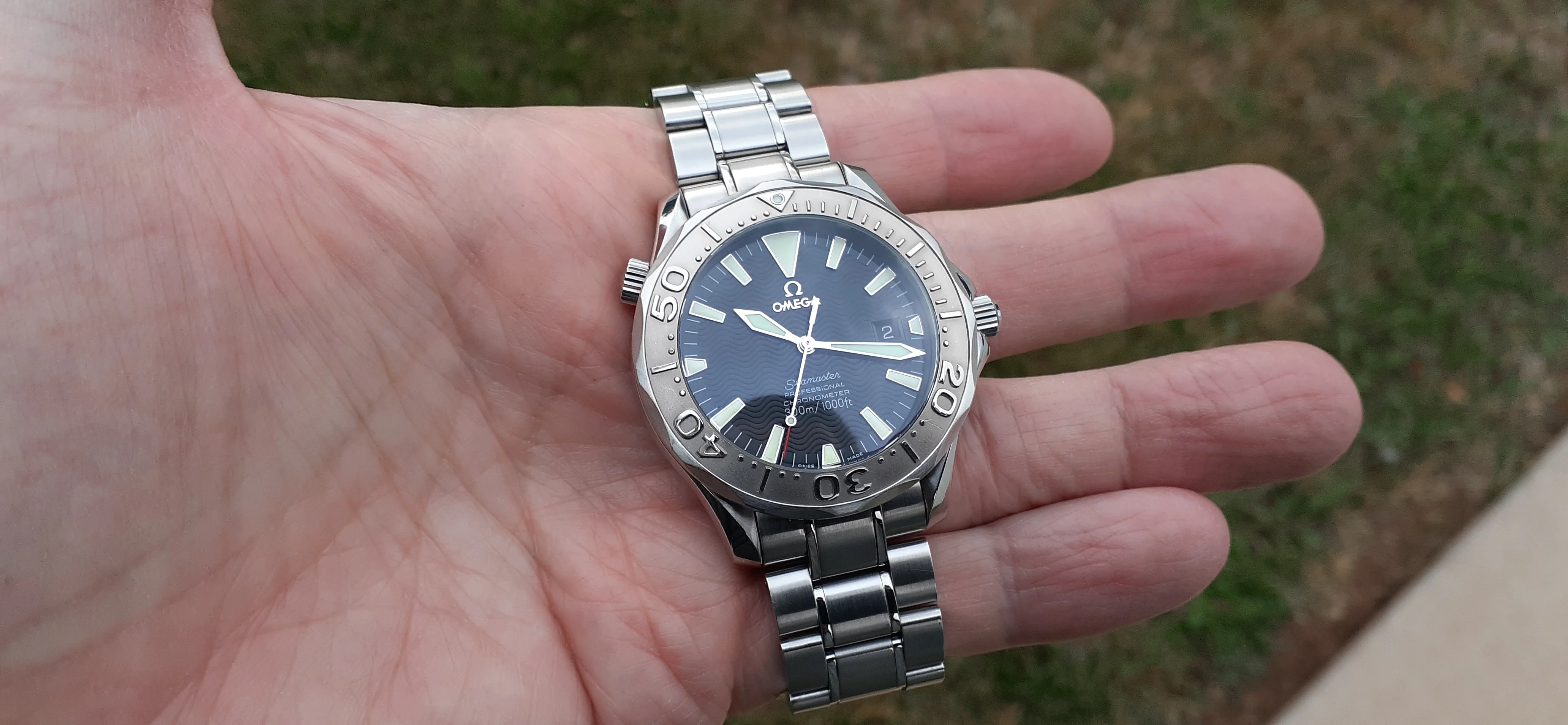 I am selling my Omega Seamaster 2230.50 "Non-America's Cup" Please look at the photos for condition. I bought it from Watch Vault NYC two or three years ago and as far as I know, it hasn't been serviced (there is even some of the red wax on the back of the case.) I timed it with WatchCheck over a week and it is averaging +7.4 sec per day. It is a great looking watch but it does have micro-scratches everywhere (I took a lot of photos today in harsh lighting to show it at it's worst) and a few deeper dings. Comes with the chronometer card, warranty card, bibliography card, three full links and one half-link only.