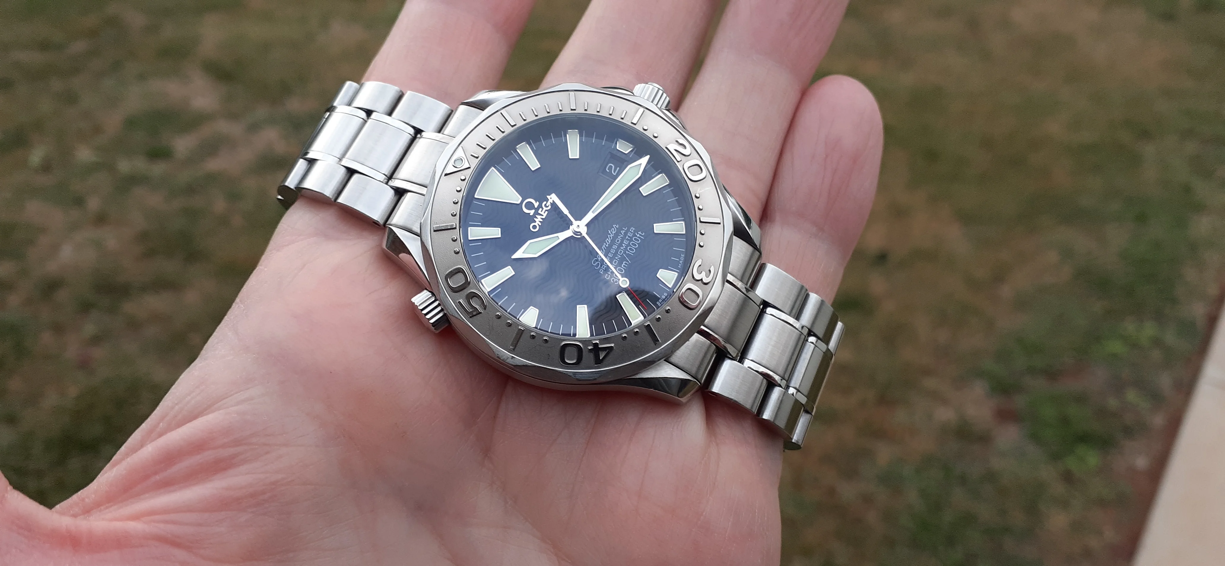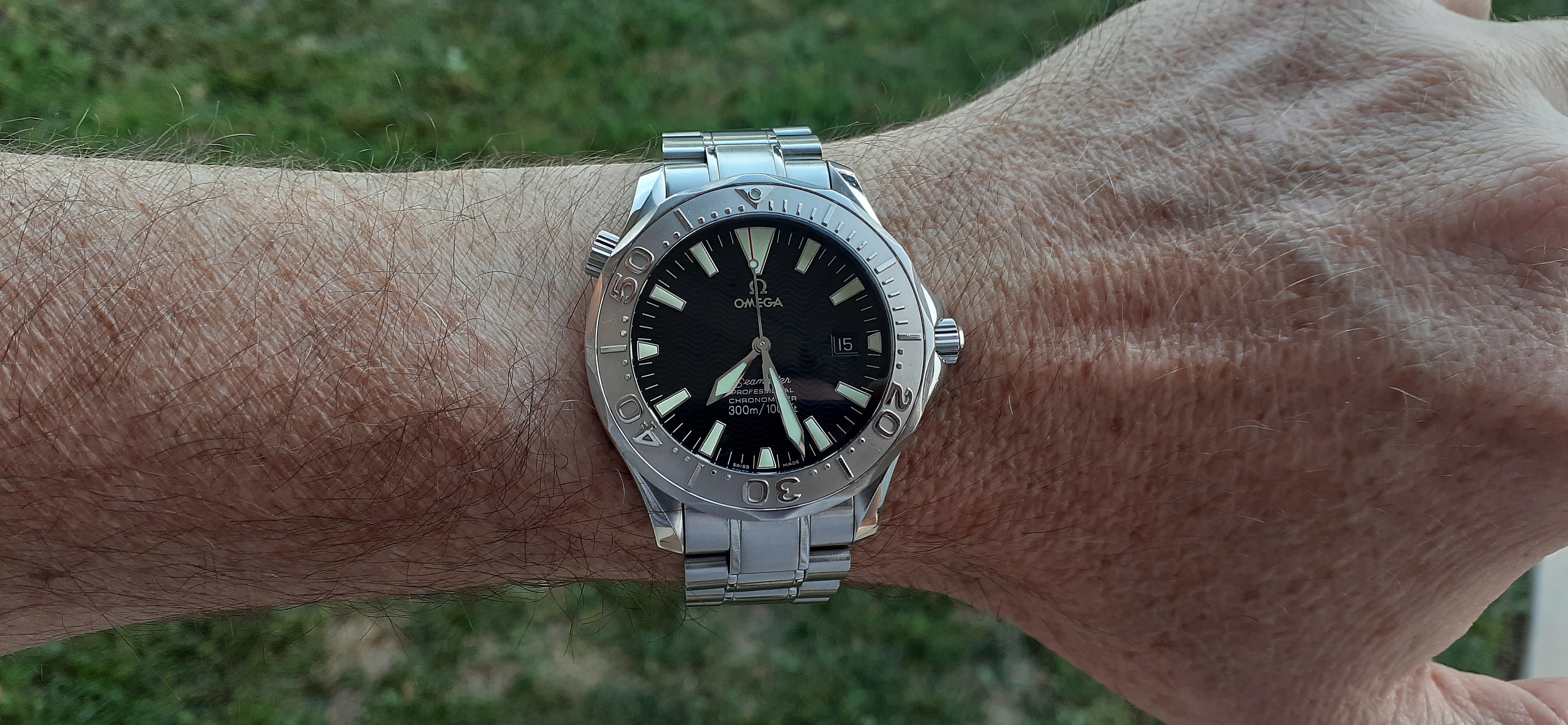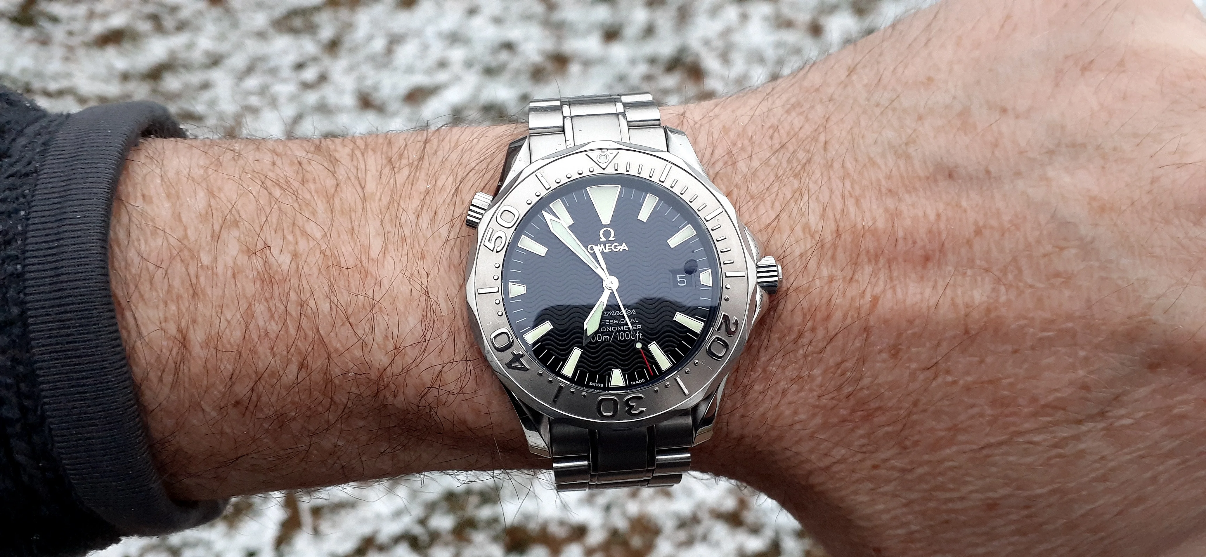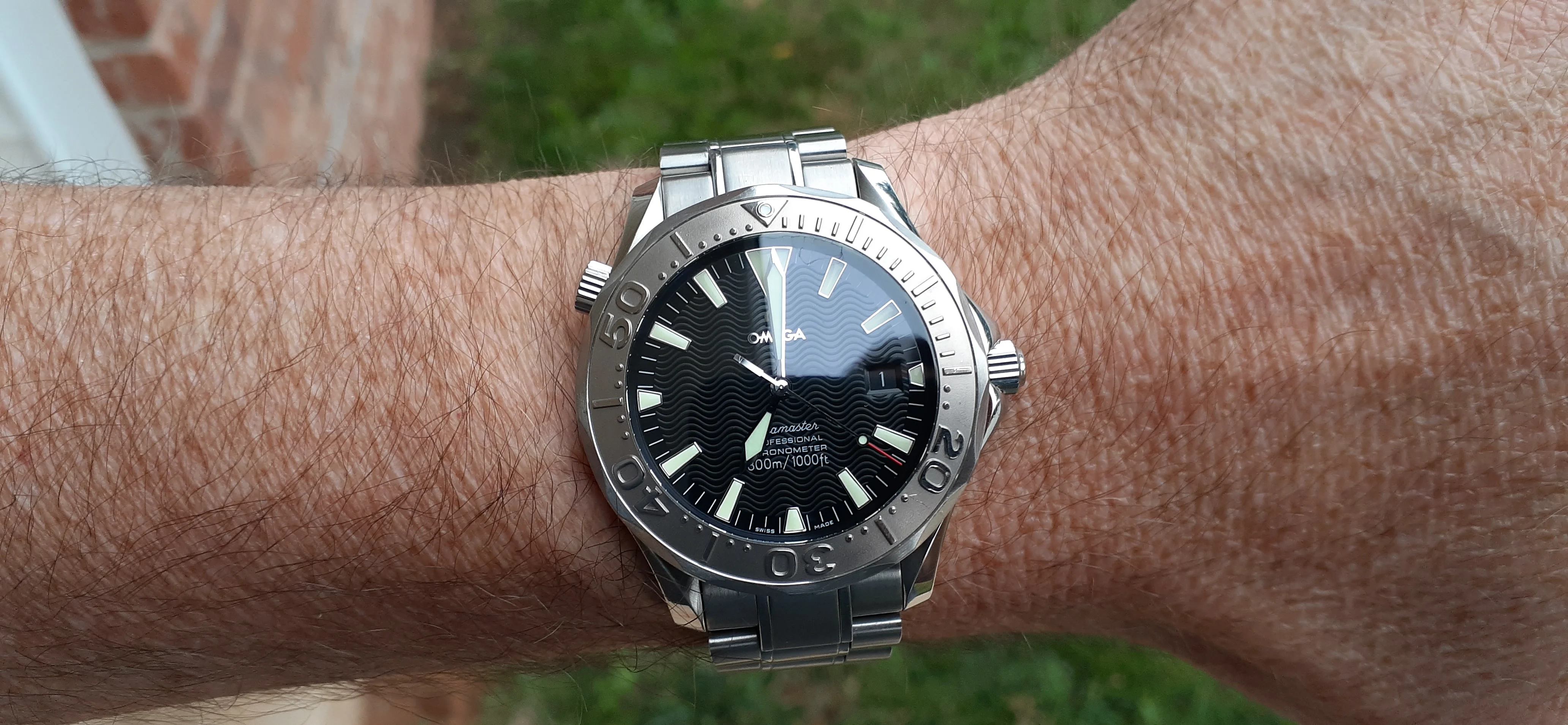 I am selling my Omega Seamaster 2230.50 "Non-America's Cup" Please look at the photos for condition. I bought it from Watch Vault NYC two or three years ago and as far as I know, it hasn't been serviced (there is even some of the red wax on the back of the case.) I timed it with WatchCheck over a week and it is averaging +7.4 sec per day. It is a great looking watch but it does have micro-scratches everywhere (I took a lot of photos today in harsh lighting to show it at it's worst) and a few deeper dings. Comes with the chronometer card, warranty card, bibliography card, three full links and one half-link only.