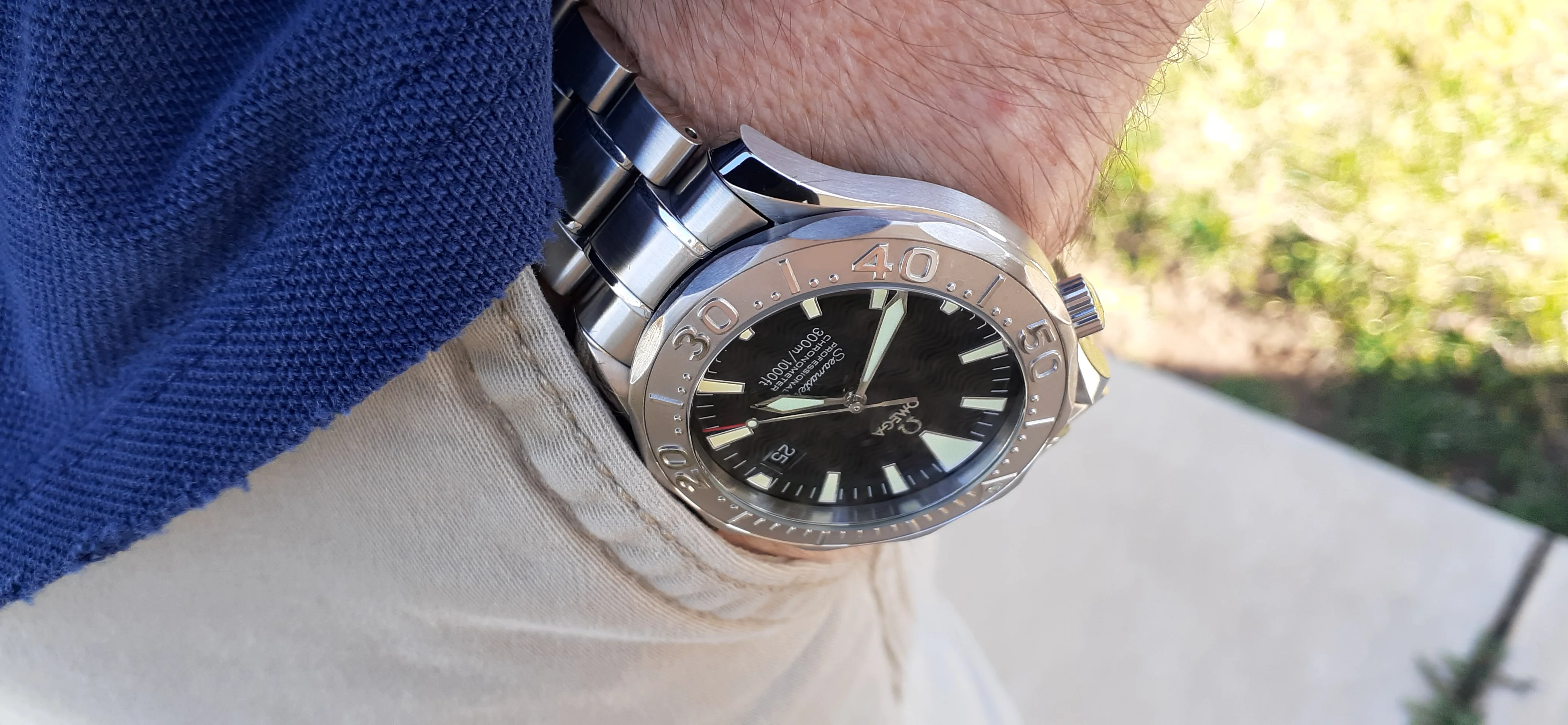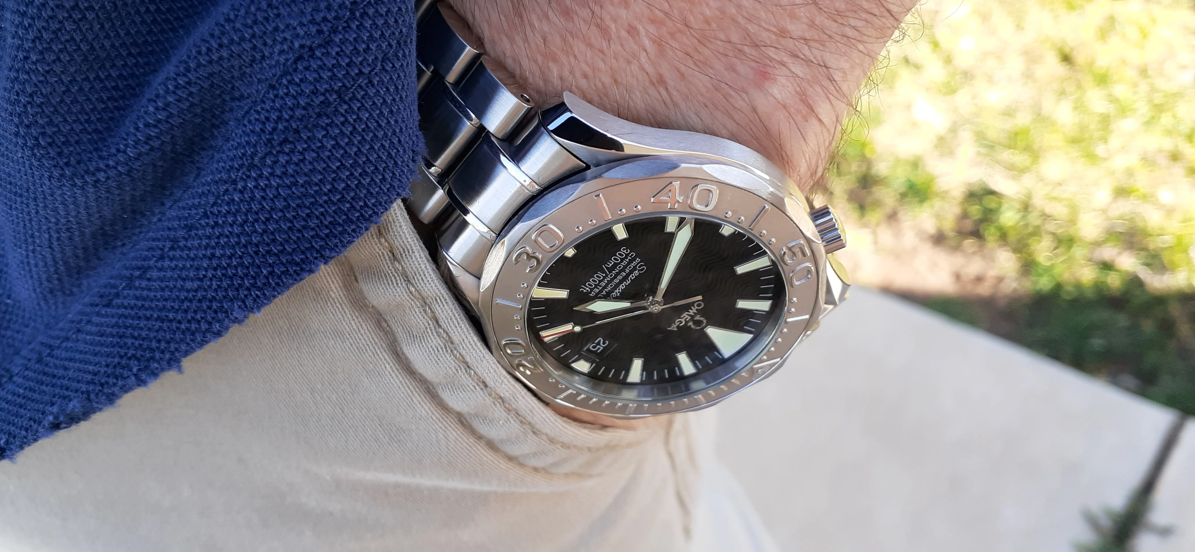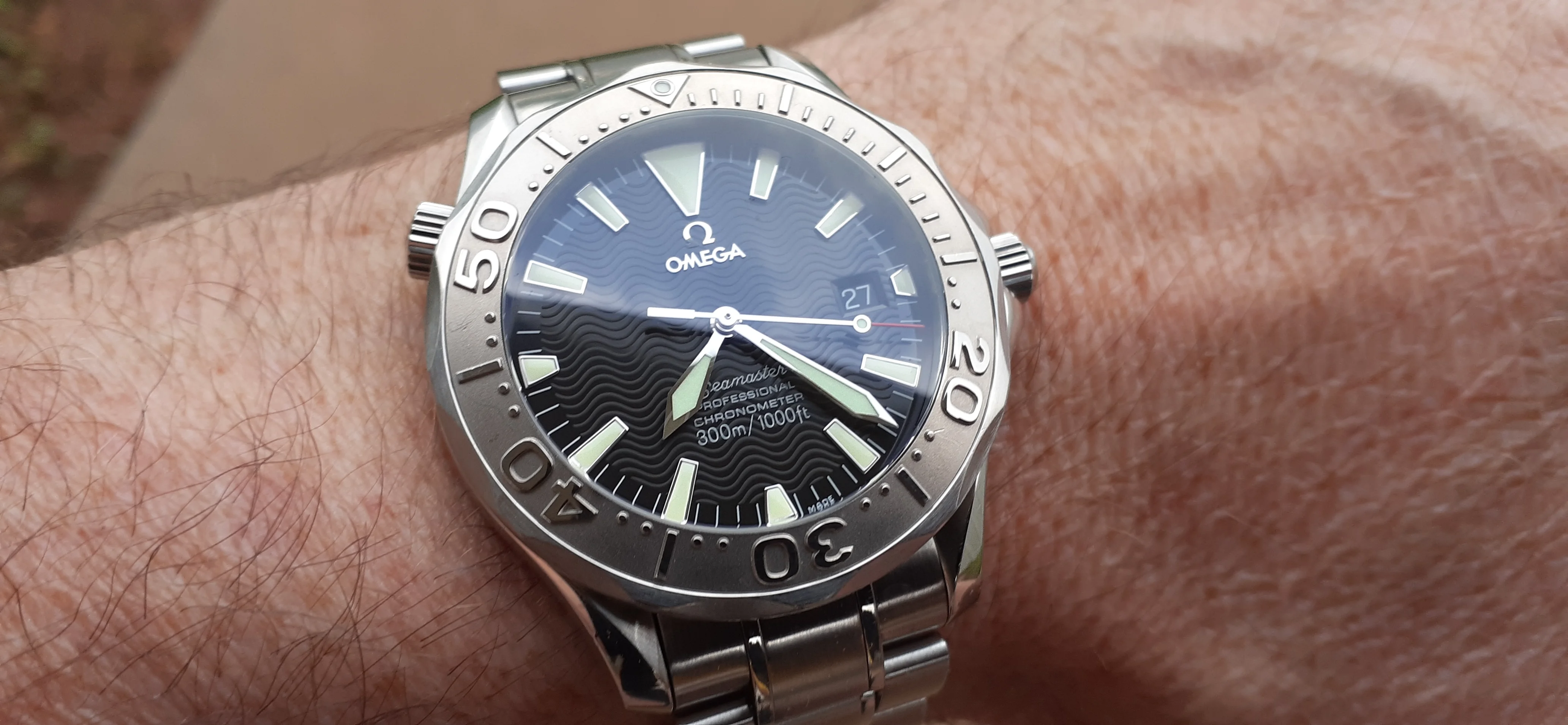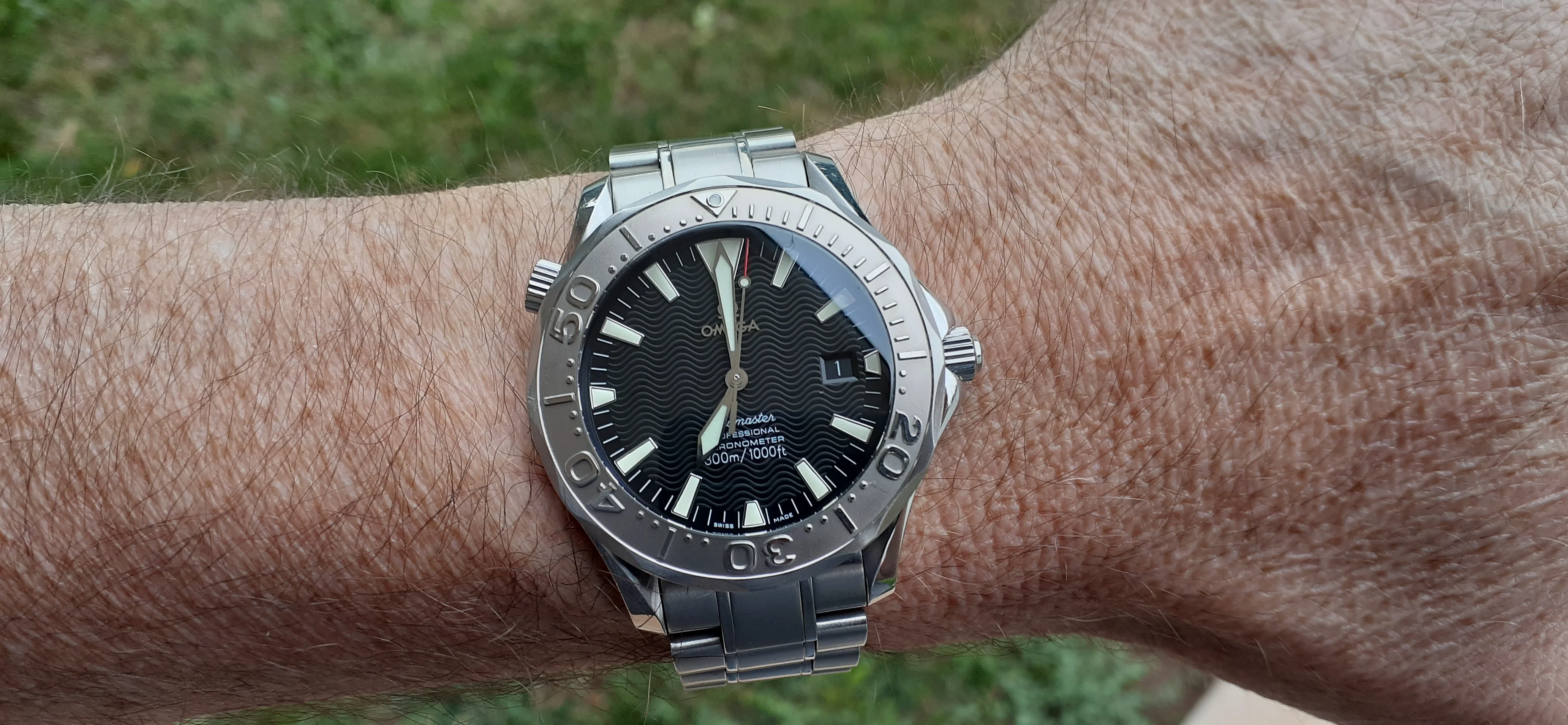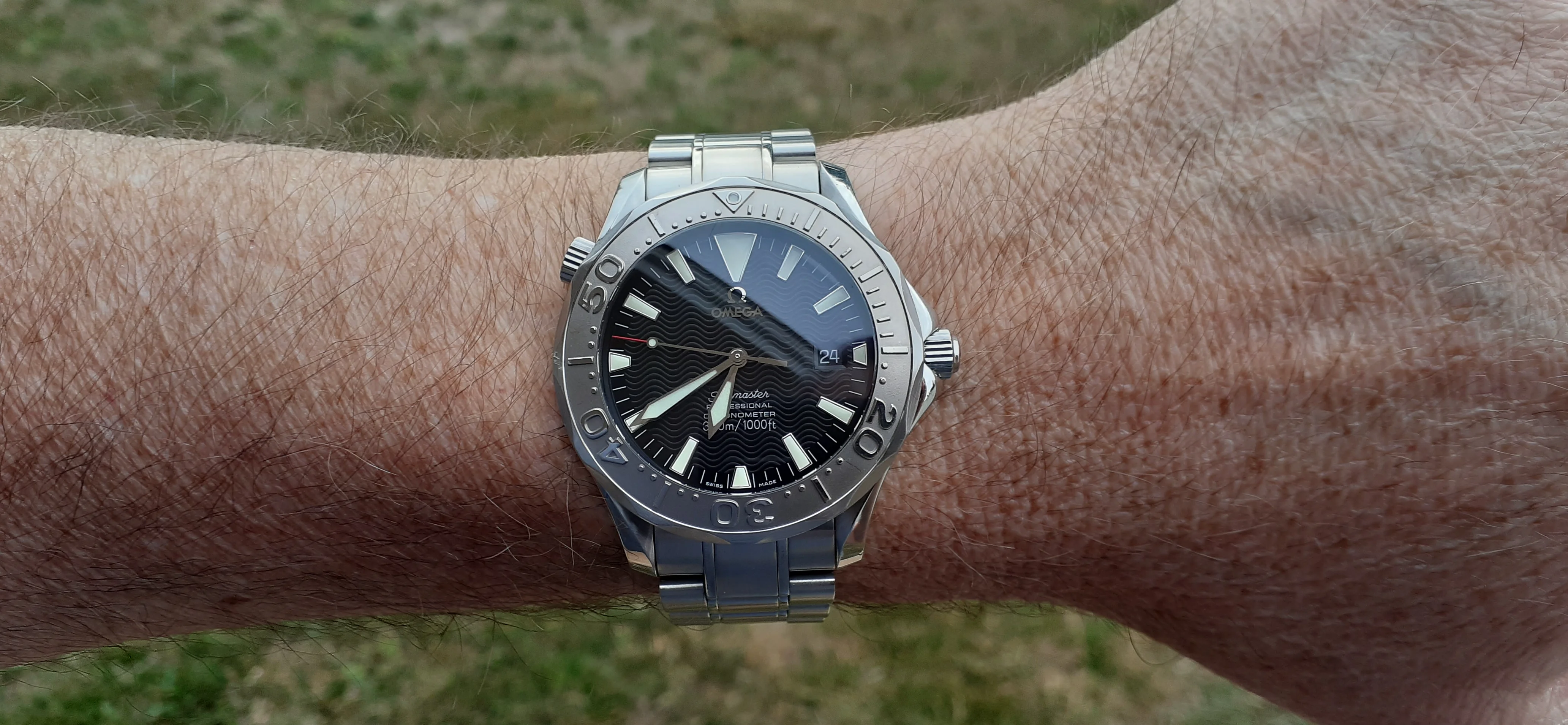 I am selling my Omega Seamaster 2230.50 "Non-America's Cup" Please look at the photos for condition. I bought it from Watch Vault NYC two or three years ago and as far as I know, it hasn't been serviced (there is even some of the red wax on the back of the case.) I timed it with WatchCheck over a week and it is averaging +7.4 sec per day. It is a great looking watch but it does have micro-scratches everywhere (I took a lot of photos today in harsh lighting to show it at it's worst) and a few deeper dings. Comes with the chronometer card, warranty card, bibliography card, three full links and one half-link only.