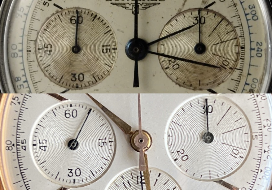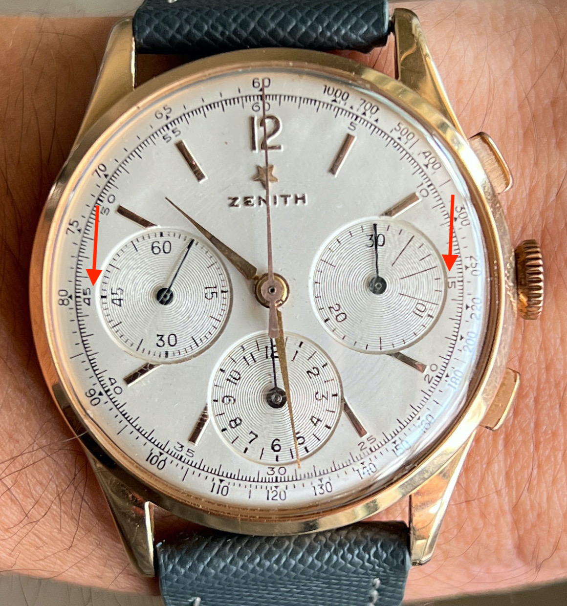 ·Presently, there is a Zenith 156H for sale on the forum. The dial is described as original but there are a number of elements that suggest, to me, that it is a redial. The most obvious issues are the atpyical fonts and poor execution of the sub-dials. Further below are two original examples for comparison. Other issues include the fonts of the tachymeter scale and seconds/minutes scale. I would be curious to hear what others think of the dial.
