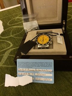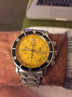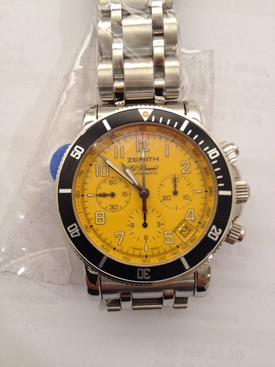 路Hi - I'm new to this site and saw Mick Tock's Mango so I wanted to show off my new acquisition. I am and have been an Omega (SMP and 60's Automatic) person but I could not resist this Rainbow "Mango". I have wanted a Zenith Chrono, El Primero for years and while looking for an Omega Chrono I ran across this one. I am not one for bright dials and am usually conservative in watch styles I like but the design seems well balanced. It even came with the original receipt. Purchased new in 2013, sized and unworn until I snagged it off an auction site. Been wearing it 5 days now and I really like the proportions and the way it fits me. The fit and finish are top notch. It looks so good I almost don't want to wear it. But heck, that's what it's for. BTW, on another forum they state that there were only 470 of these made but I have not been able to confirm that.