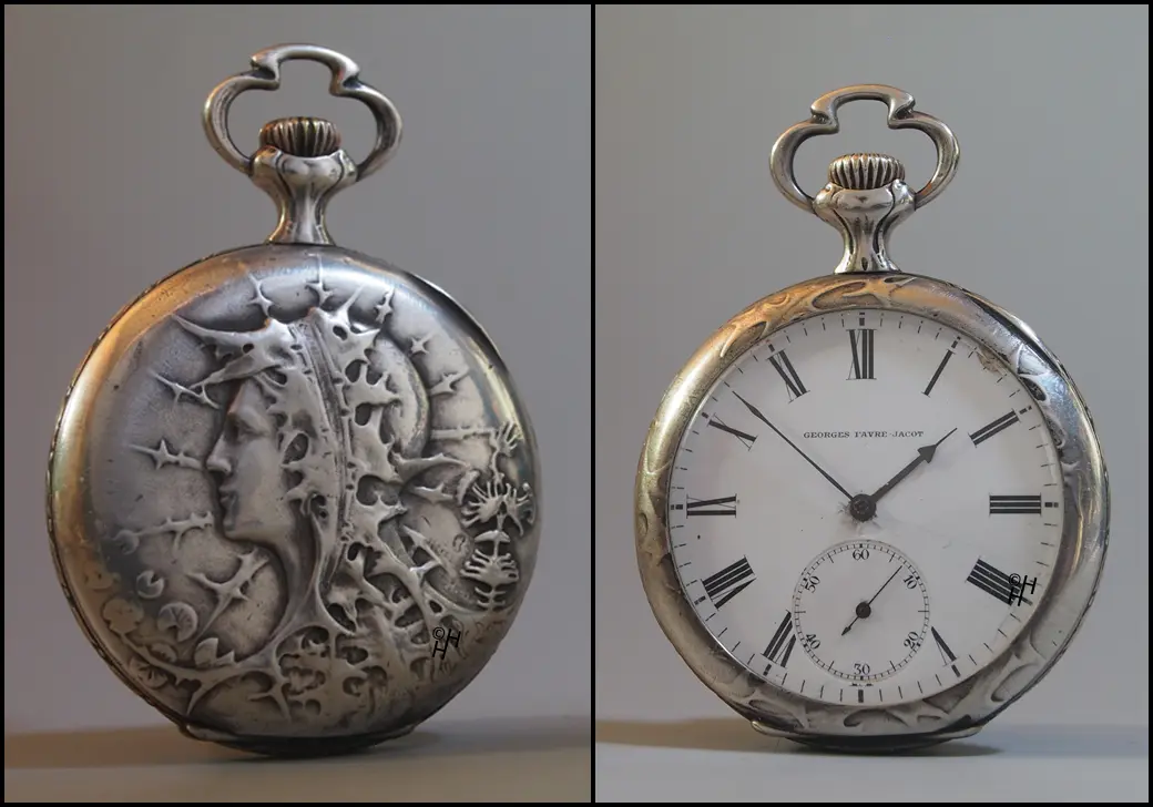 From a Swiss collection: Billodes pocket watch, custom-made case. The inlay on the back finest handwork with burin.