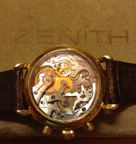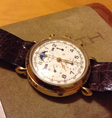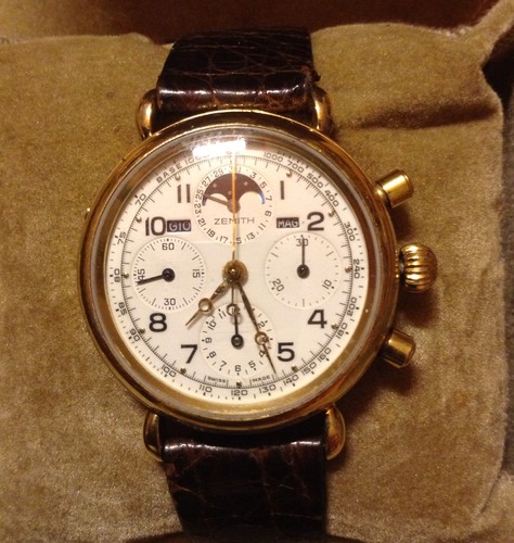 ··Mrs Nataf's Other SonHere's an interesting one - A Zenith Tri-Compax from the mid 1980s. This is a confection assembled by Zenith from warehoused movements not long after its resurrection as a mechanical watch manufacture. There were Zenith-branded Tri-Compaxes when the model was current in the 1950s, housed in very different cases from this one. This one is a bit of an ersatz, but interesting nonetheless. Note the movement carries both UG caliber designation (281) and Zenith (136 HC).