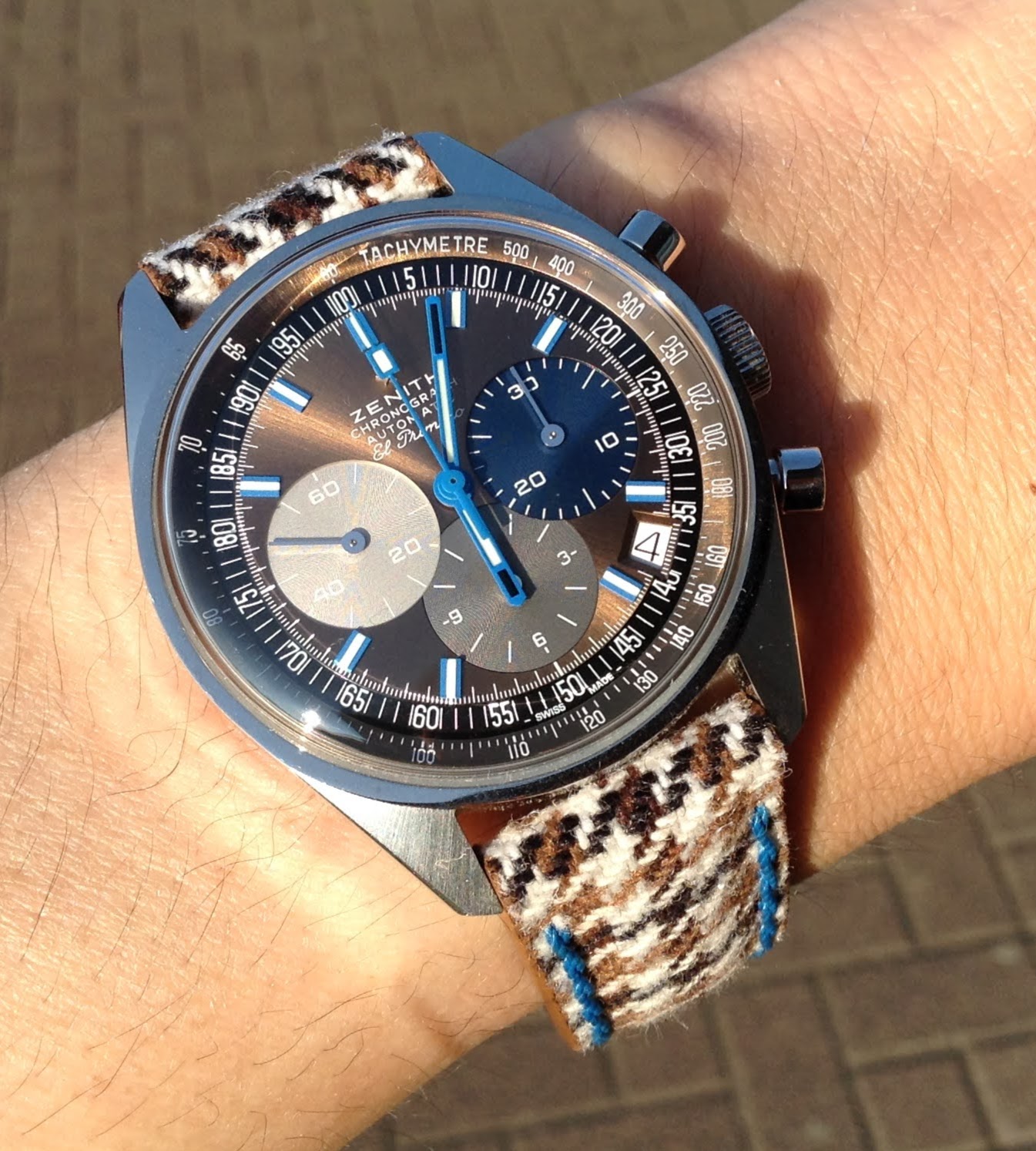 Let me be frank; I was longing for an A386 re-edition or "revival", as Zénith likes to label their tributes. The A386ME was the fifth such revival to be released and for me, the only obtainable (affordable) one. You may recall from above that Zénith first released a SS A386 from the Jan. 2019 50th Anniversary set and in Mar. 2019 El Primero A386 Revivals, offered only in white, yellow & rose gold. Cost aside, I would have opted for the SS A386 first and the WG A386 but again, not within my reach. So I was pretty excited when Zénith announced the A386ME - an affordable SS A386 "revival" and with a beautiful and special version of the original dial to boot! If I had a choice and this reference being my first and only Zénith, I would have opted for the original dial, simply because it accurately represents the original 1969 dial. That being said, this beautiful varying-blue colorway is gorgeous and just as enticing as the original colorway, if not more so. I also find the colorway goes really nicely with the traditional red seconds hand. That this dial was a prototype from the 60s (or 70s) was the proverbial cherry on top.